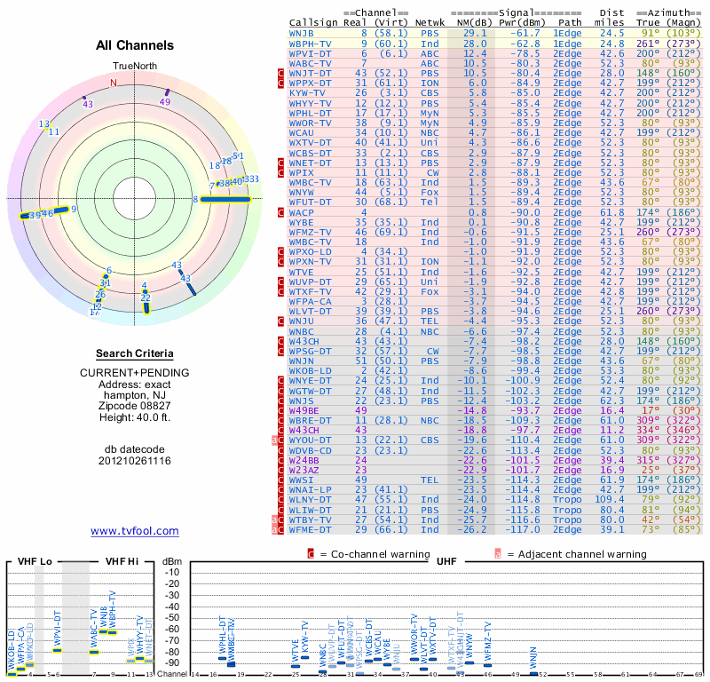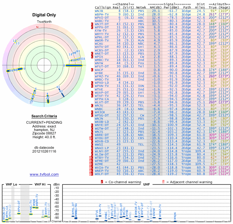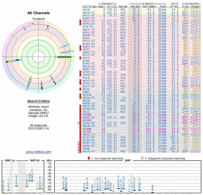 Here are the results for your location. The transmitter database was last updated on June 7, 2013. For more information about these plots and how to interpret them, please check out the Signal Analysis FAQ.