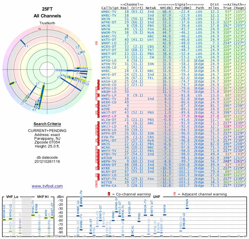 Here are the results for your location. The transmitter database was last updated on June 7, 2013. For more information about these plots and how to interpret them, please check out the Signal Analysis FAQ.