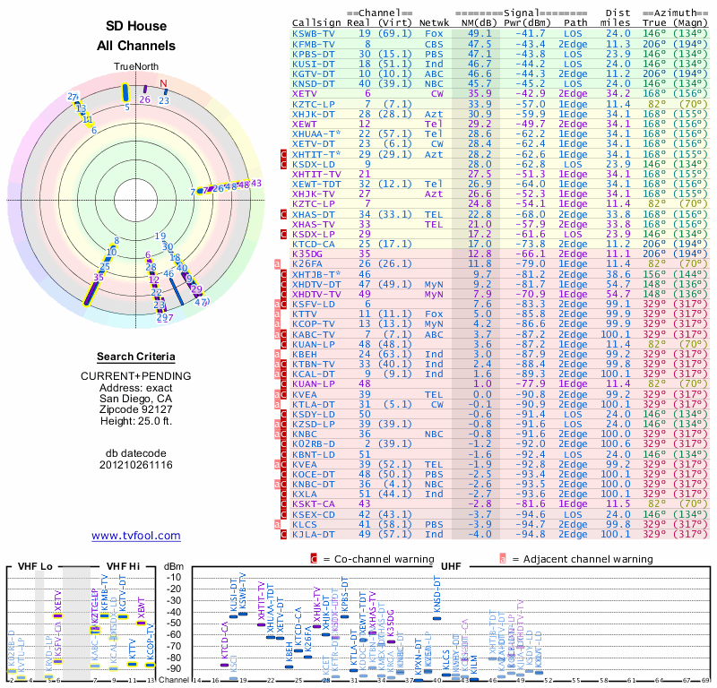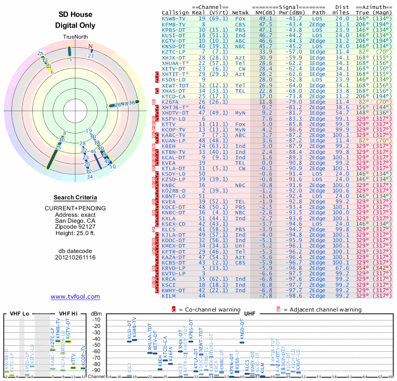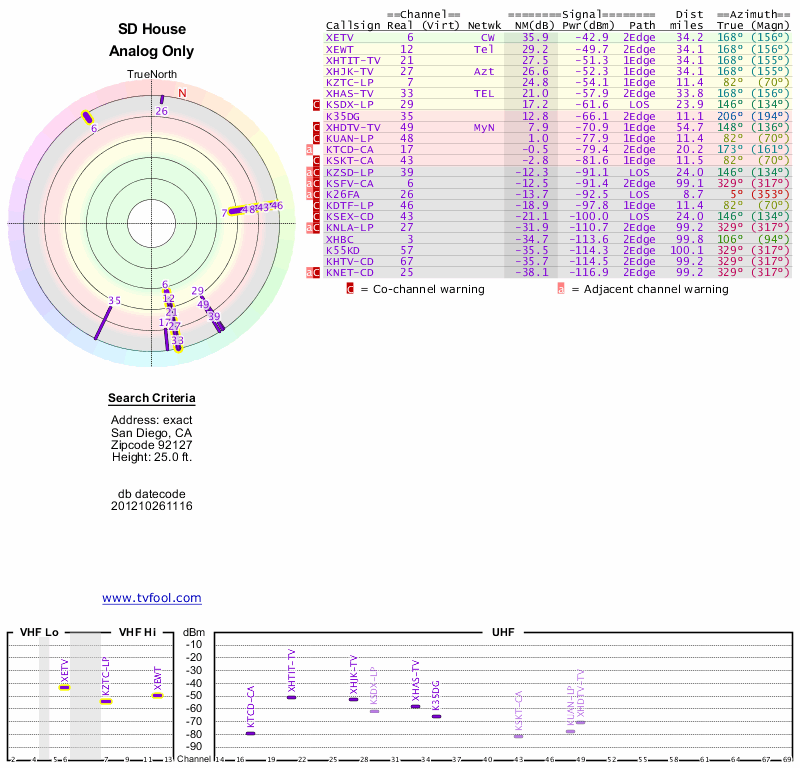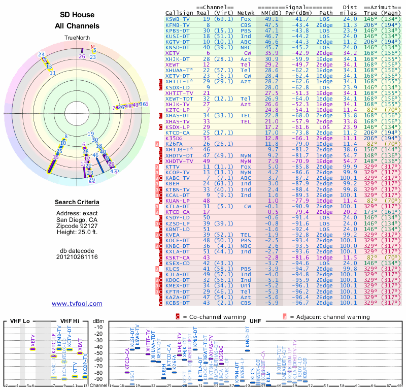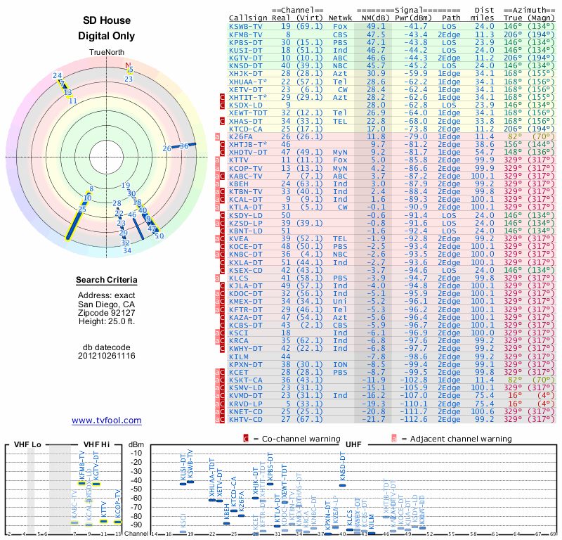 Here are the results for your location. The transmitter database was last updated on June 7, 2013. For more information about these plots and how to interpret them, please check out the Signal Analysis FAQ.