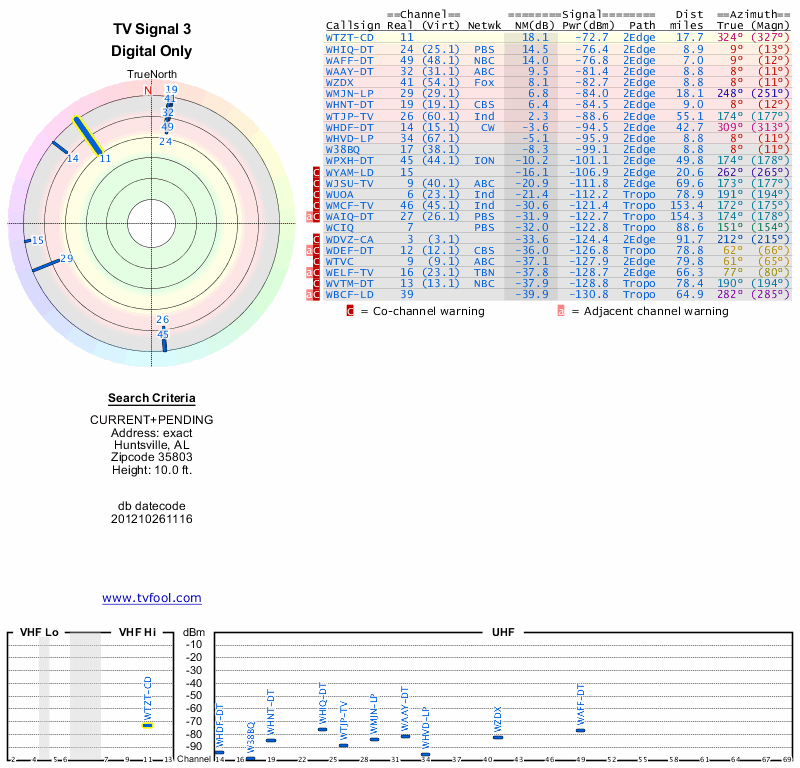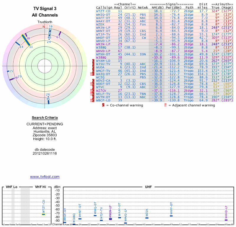 Here are the results for your location. The transmitter database was last updated on June 7, 2013. For more information about these plots and how to interpret them, please check out the Signal Analysis FAQ.