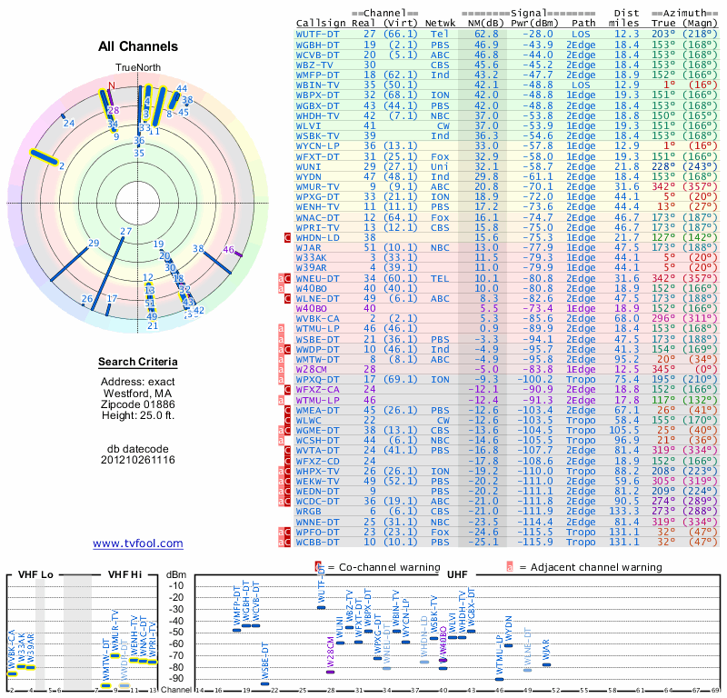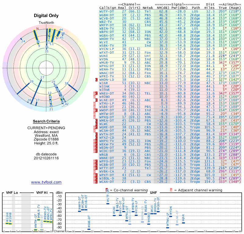 Here are the results for your location. The transmitter database was last updated on June 7, 2013. For more information about these plots and how to interpret them, please check out the Signal Analysis FAQ.