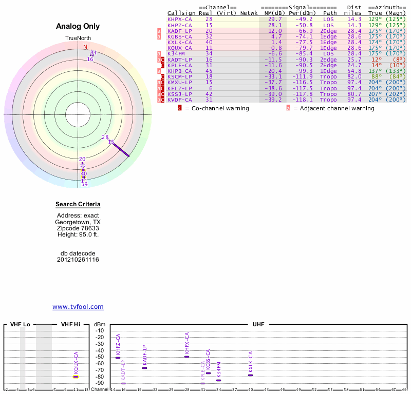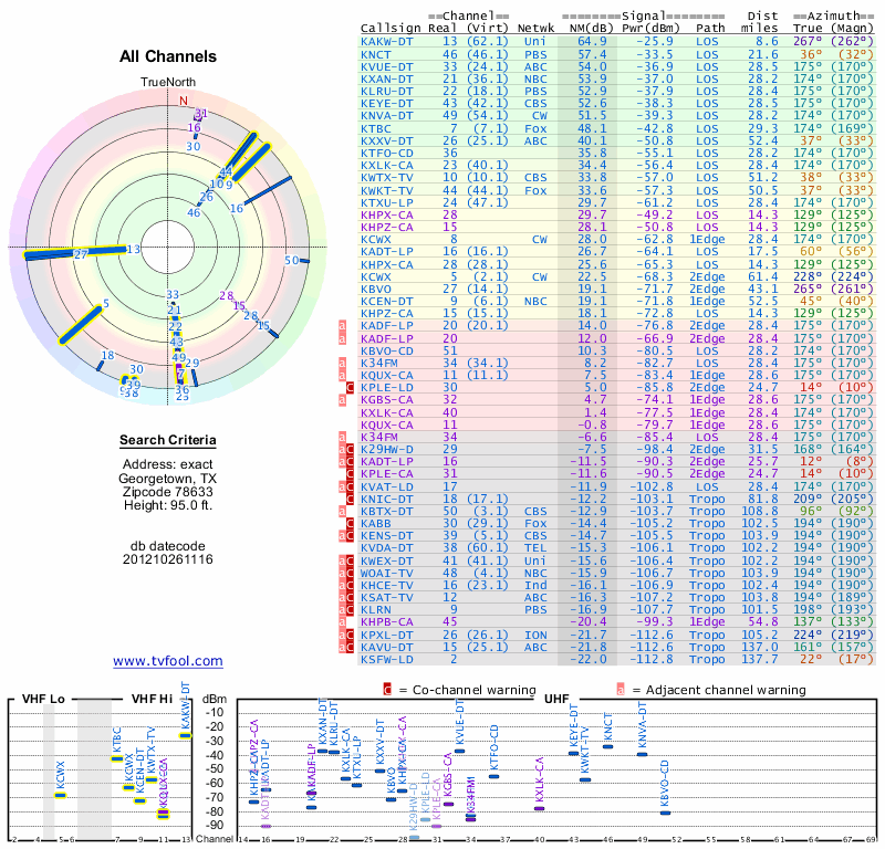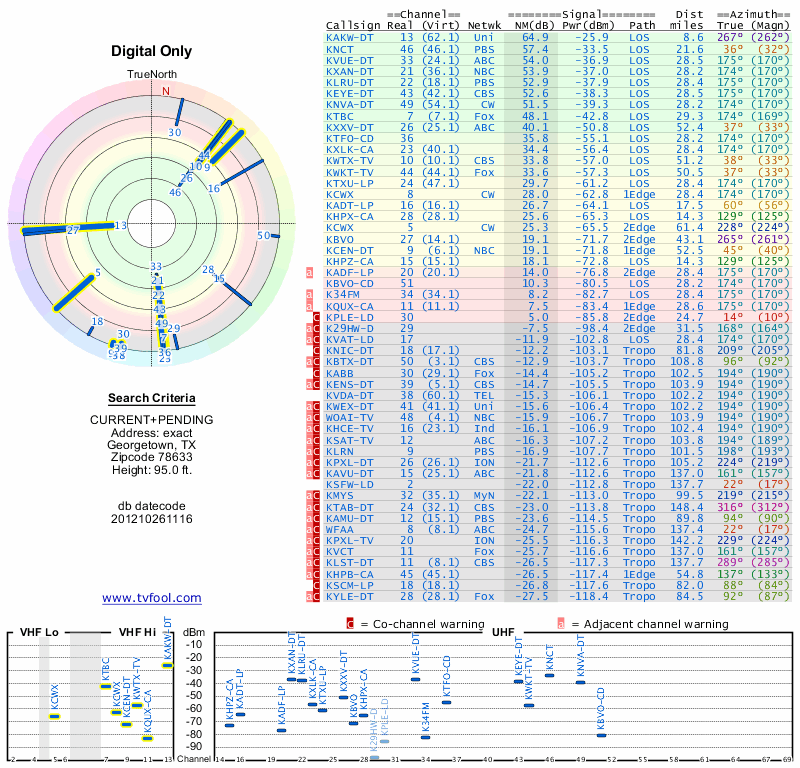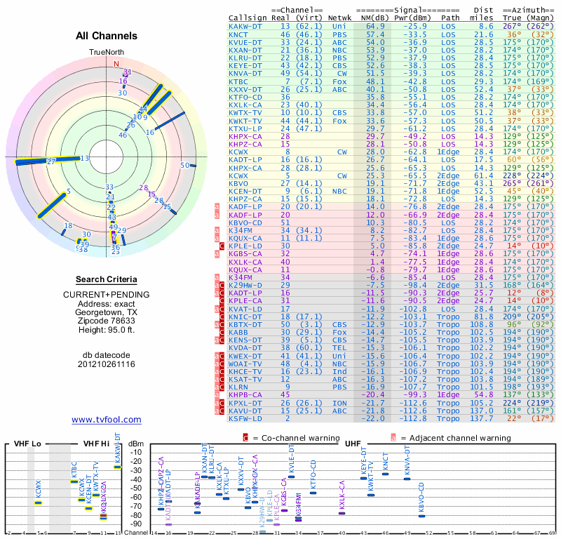 Here are the results for your location. The transmitter database was last updated on June 7, 2013. For more information about these plots and how to interpret them, please check out the Signal Analysis FAQ.