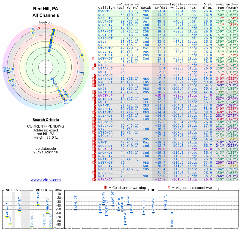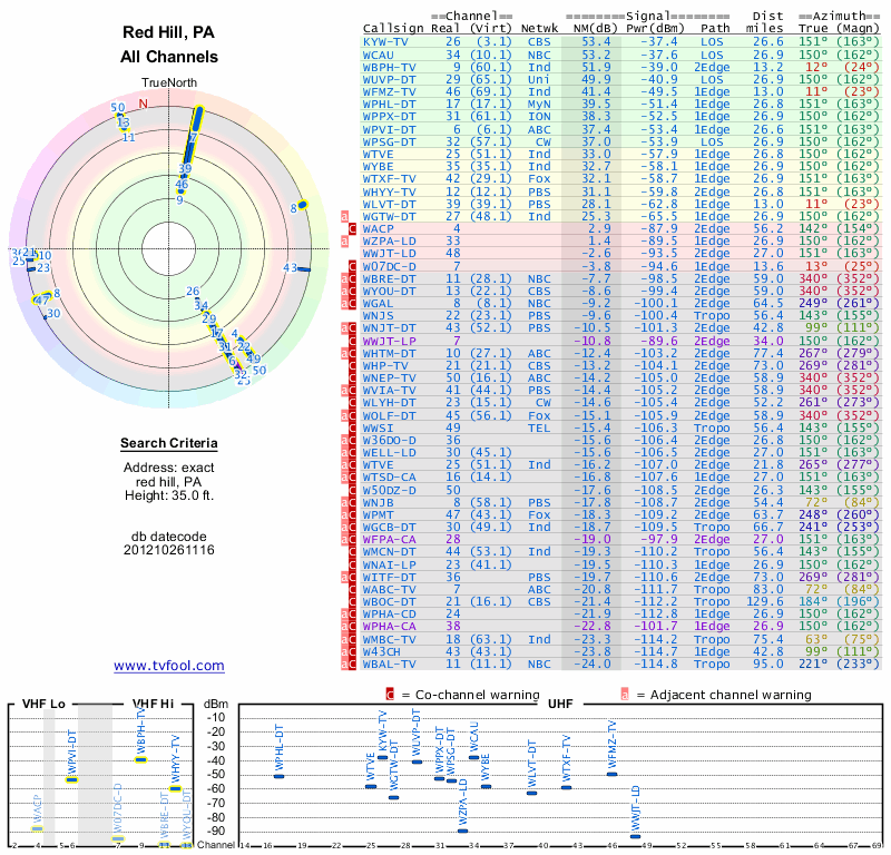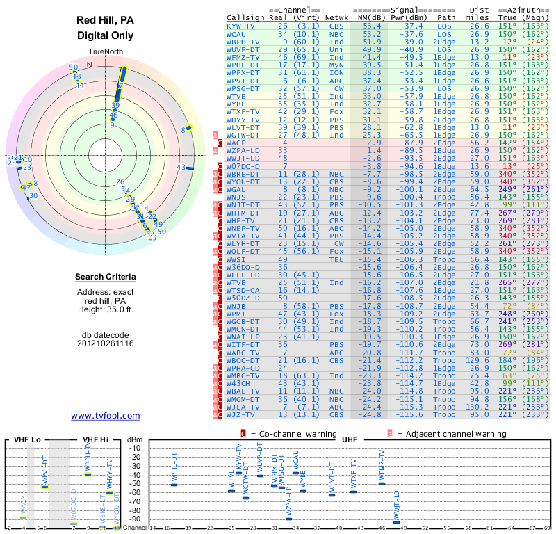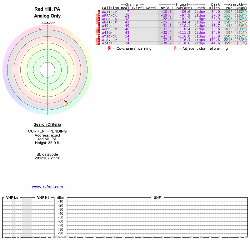 Here are the results for your location. The transmitter database was last updated on June 7, 2013. For more information about these plots and how to interpret them, please check out the Signal Analysis FAQ.