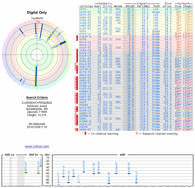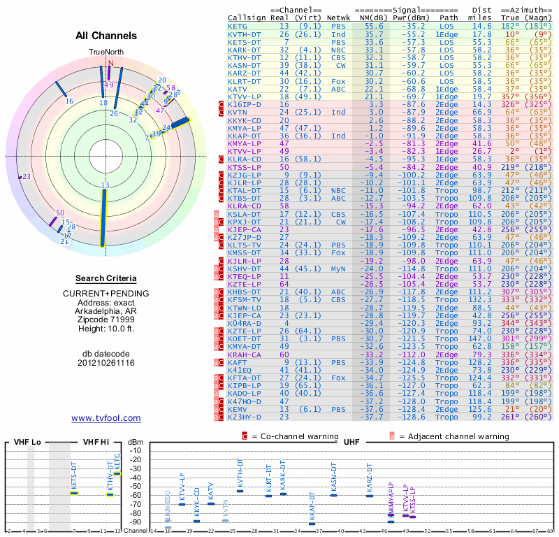 Here are the results for your location. The transmitter database was last updated on June 7, 2013. For more information about these plots and how to interpret them, please check out the Signal Analysis FAQ.