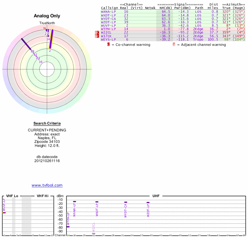 Here are the results for your location. The transmitter database was last updated on June 7, 2013. For more information about these plots and how to interpret them, please check out the Signal Analysis FAQ.