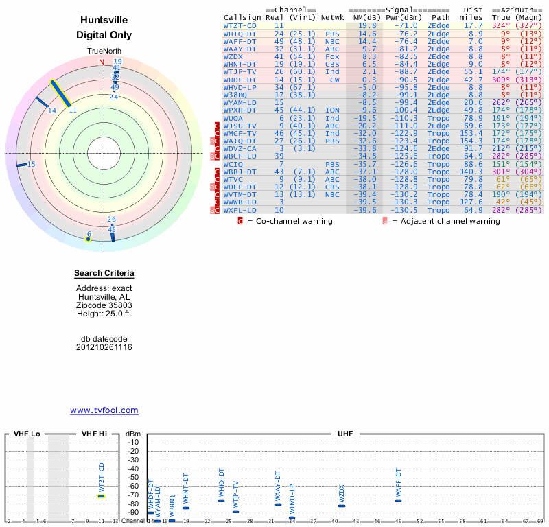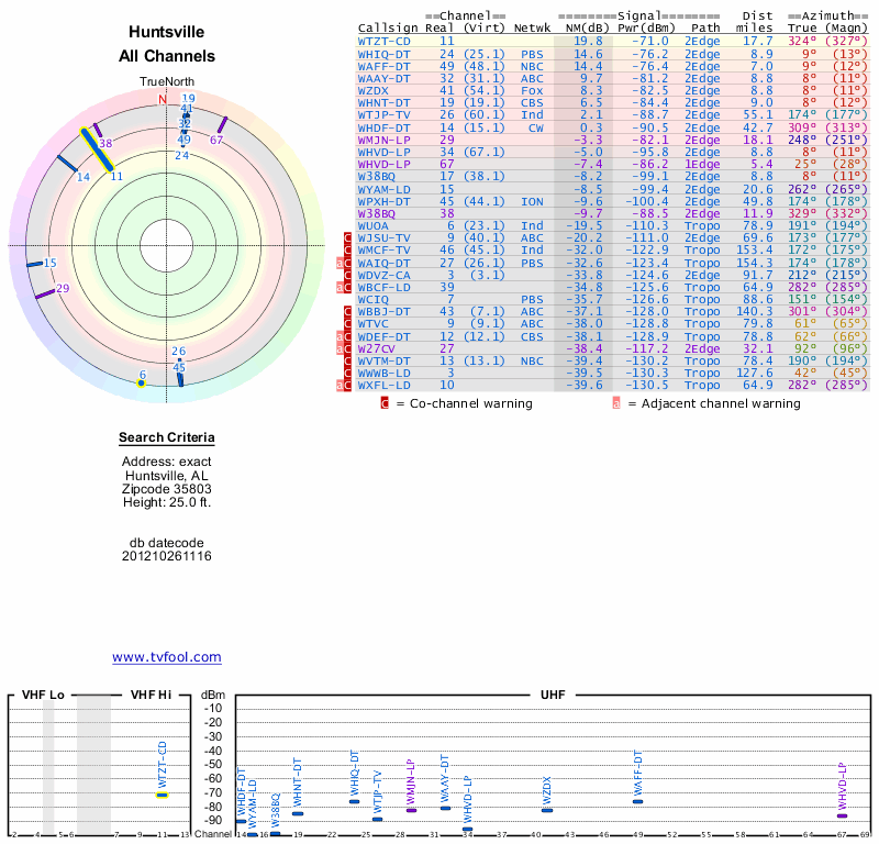Here are the results for your location. The transmitter database was last updated on June 7, 2013. For more information about these plots and how to interpret them, please check out the Signal Analysis FAQ.