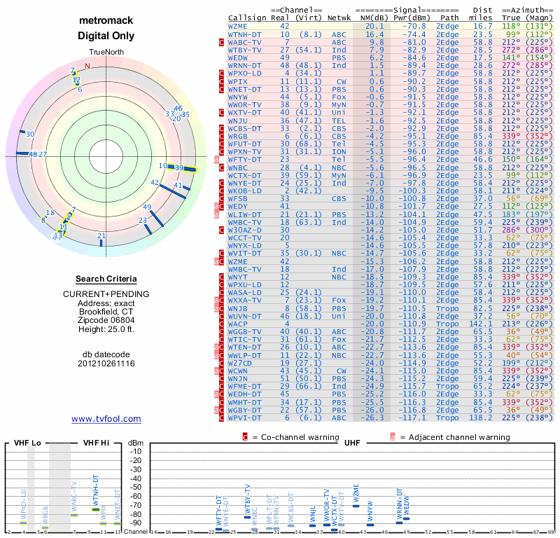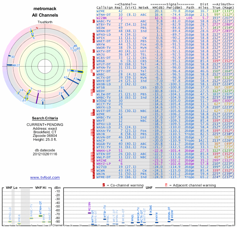 Here are the results for your location. The transmitter database was last updated on June 7, 2013. For more information about these plots and how to interpret them, please check out the Signal Analysis FAQ.