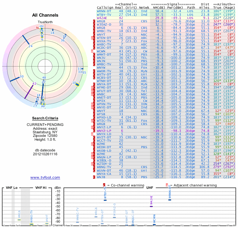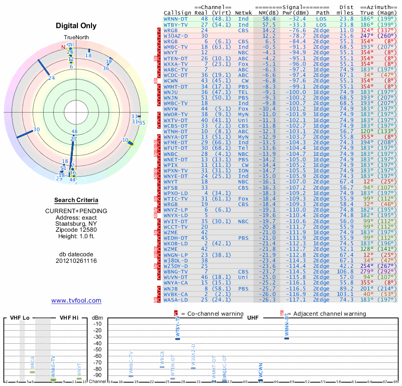 Here are the results for your location. The transmitter database was last updated on June 7, 2013. For more information about these plots and how to interpret them, please check out the Signal Analysis FAQ.