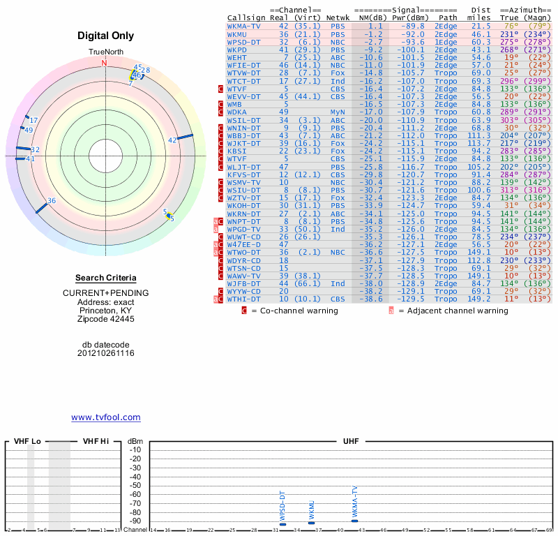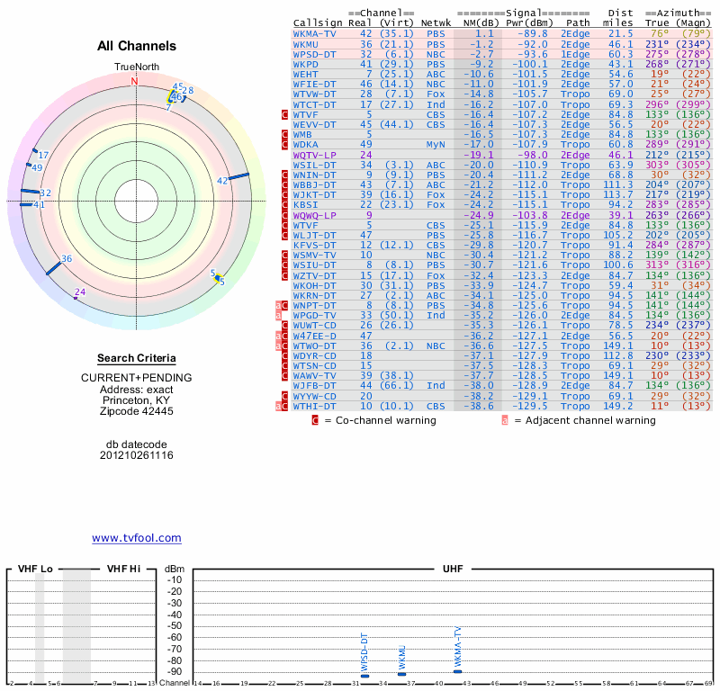 Here are the results for your location. The transmitter database was last updated on June 7, 2013. For more information about these plots and how to interpret them, please check out the Signal Analysis FAQ.