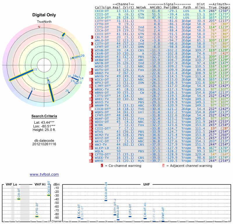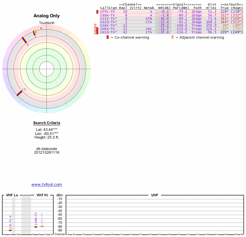 Here are the results for your location. The transmitter database was last updated on June 7, 2013. For more information about these plots and how to interpret them, please check out the Signal Analysis FAQ.