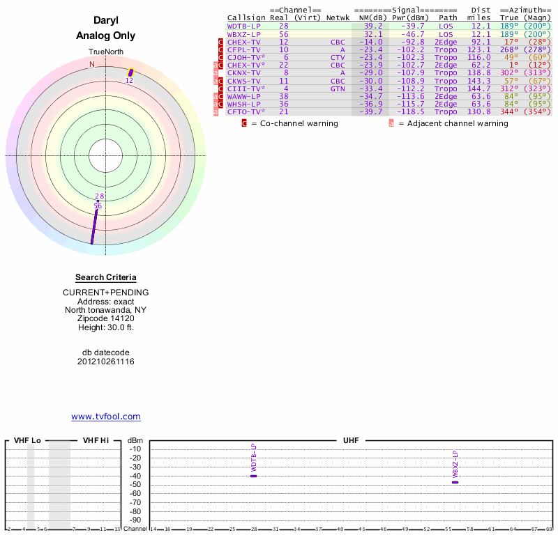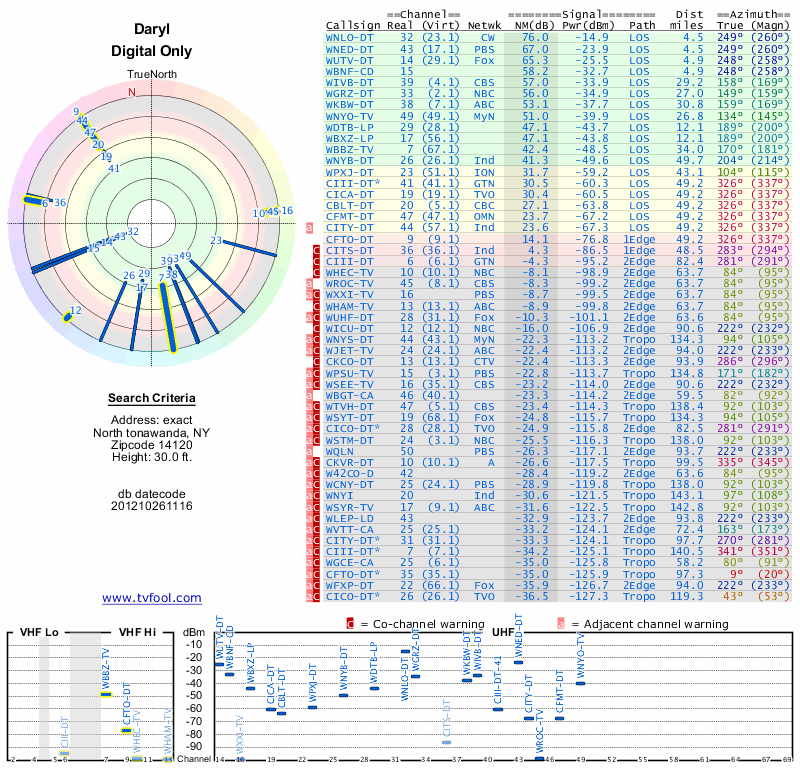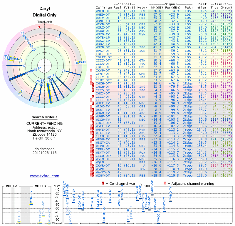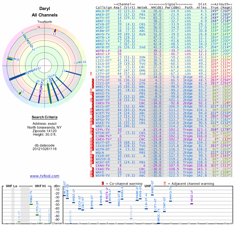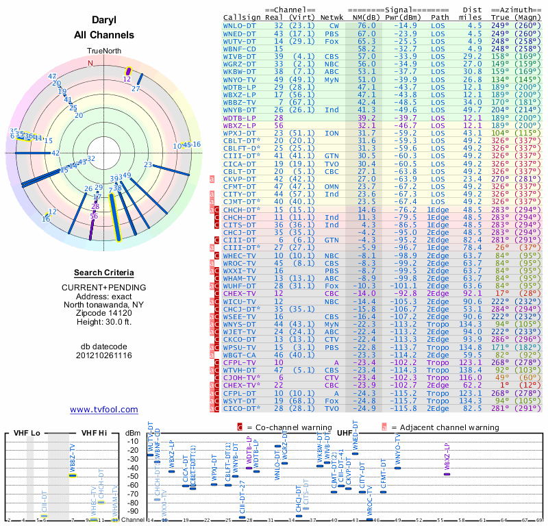 Here are the results for your location. The transmitter database was last updated on June 7, 2013. For more information about these plots and how to interpret them, please check out the Signal Analysis FAQ.