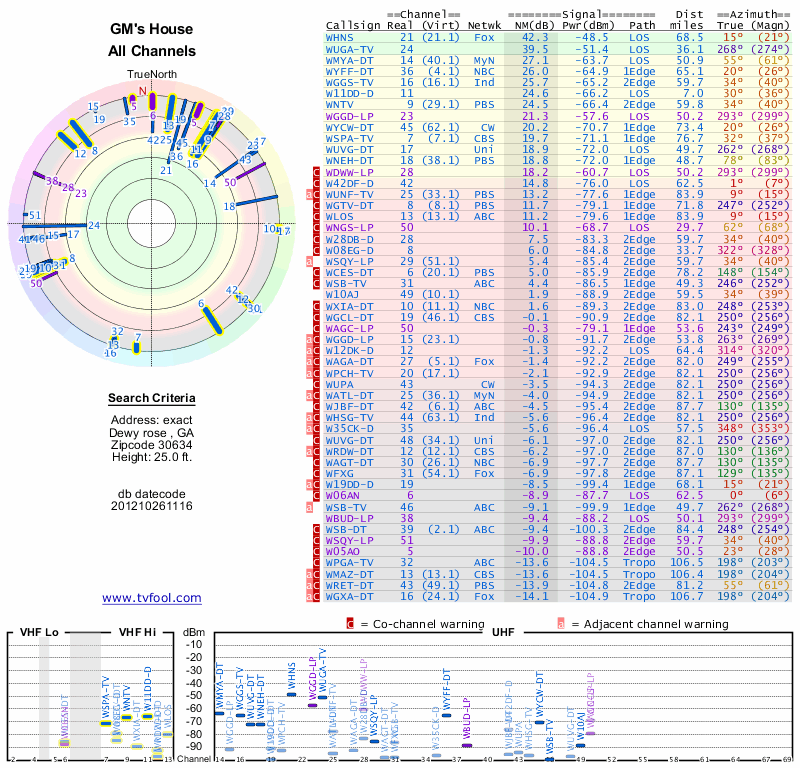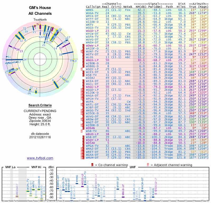 Here are the results for your location. The transmitter database was last updated on June 7, 2013. For more information about these plots and how to interpret them, please check out the Signal Analysis FAQ.