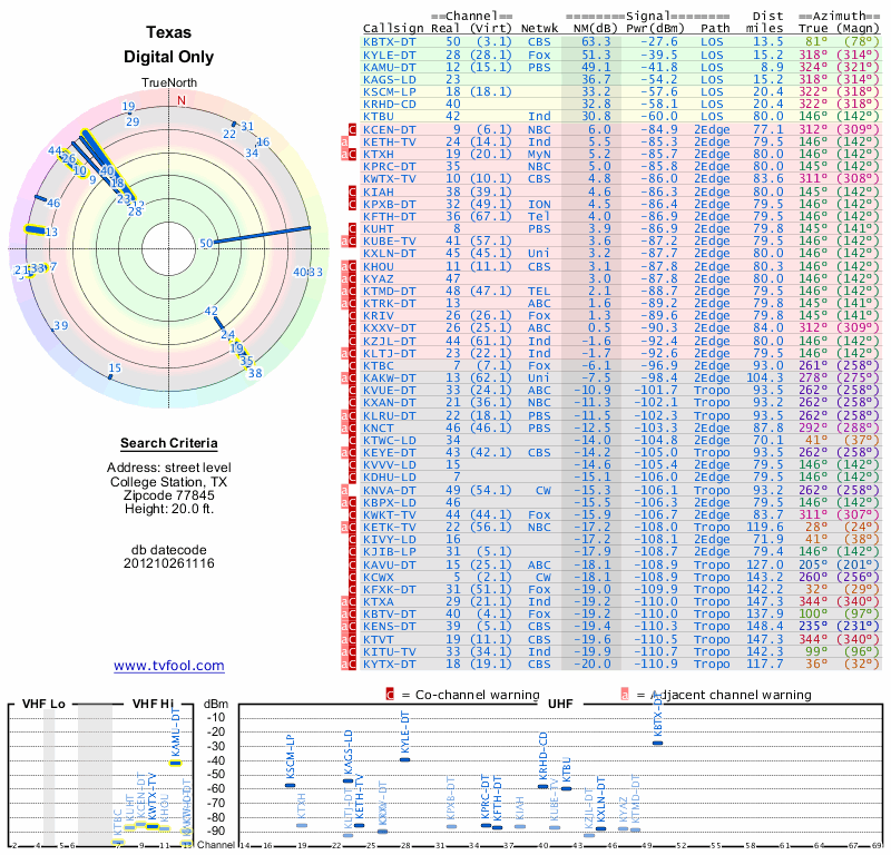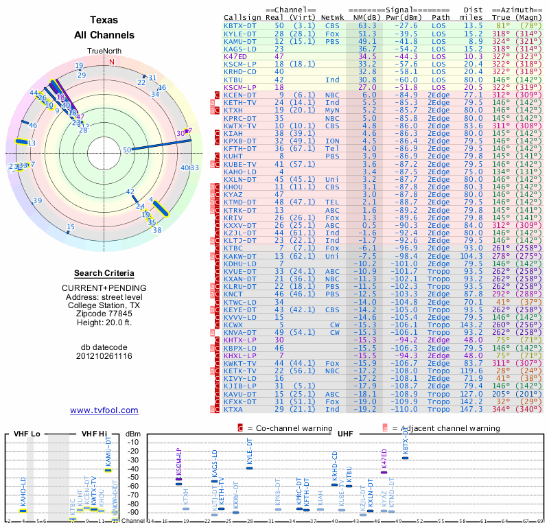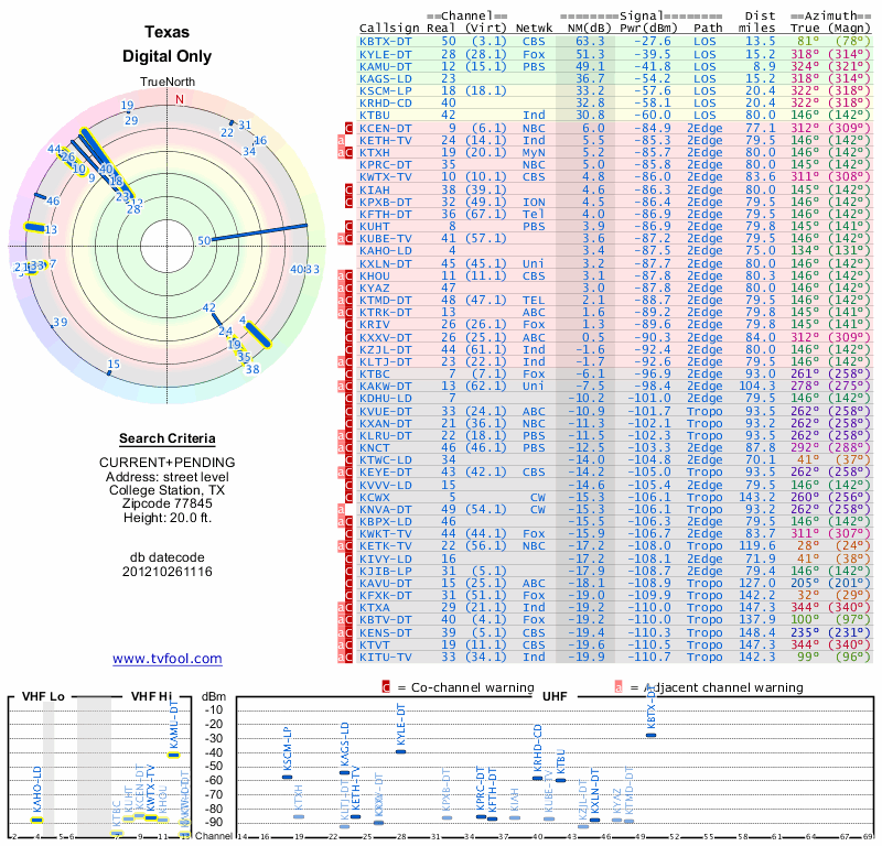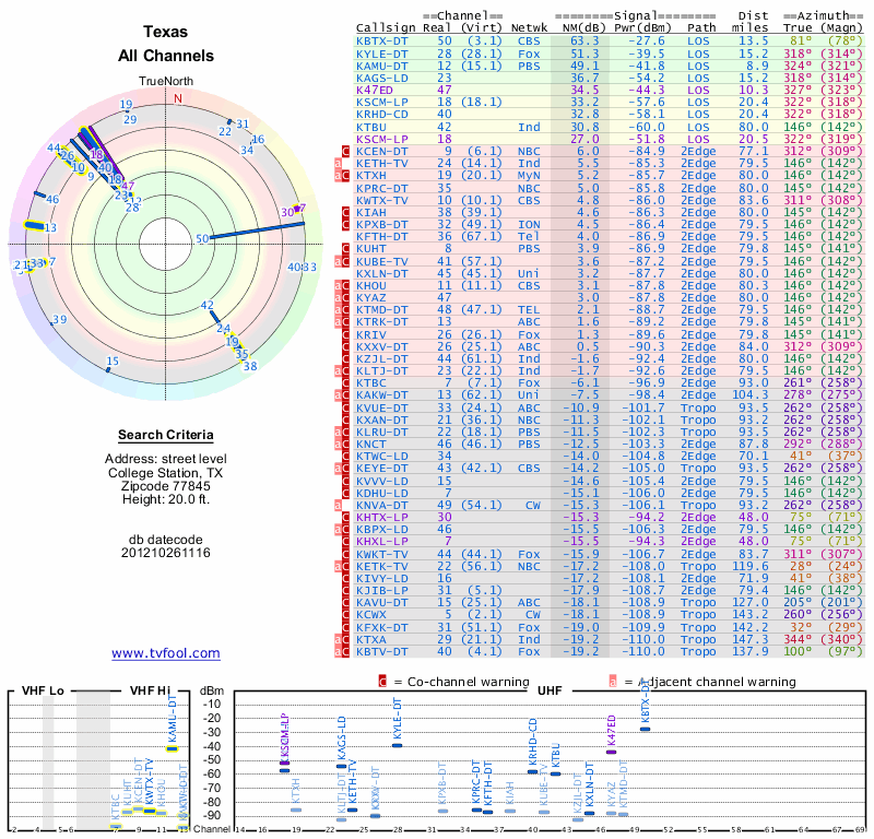 Here are the results for your location. The transmitter database was last updated on June 7, 2013. For more information about these plots and how to interpret them, please check out the Signal Analysis FAQ.