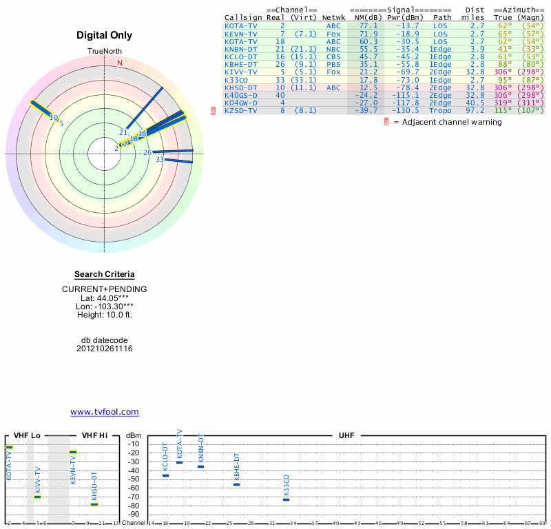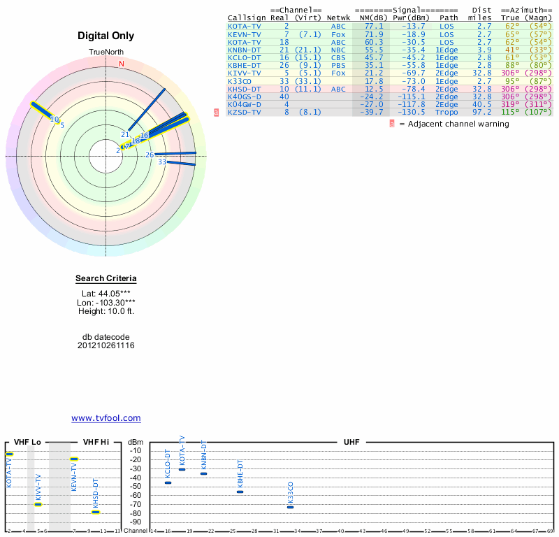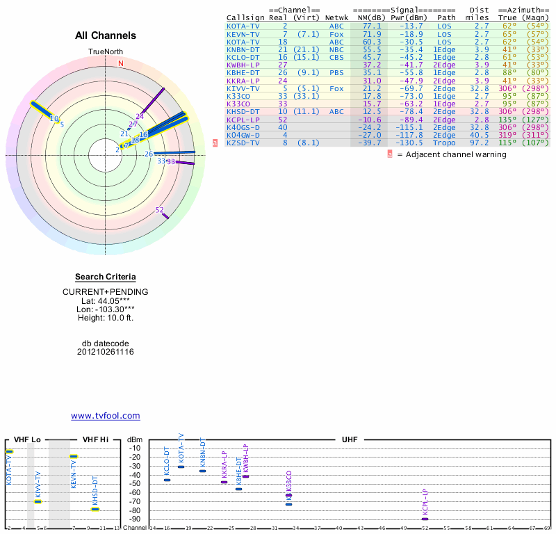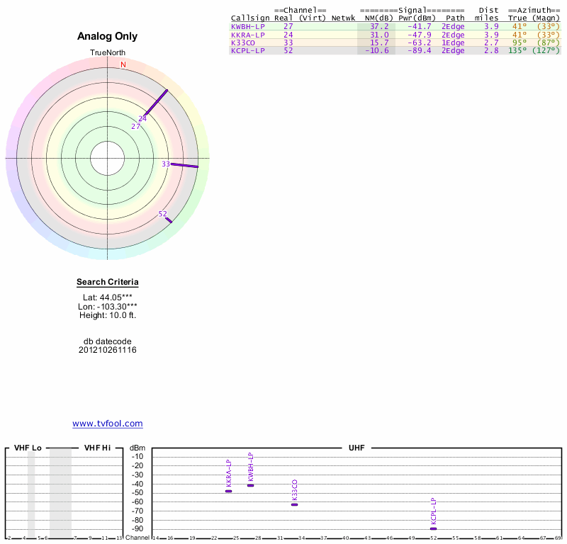 Here are the results for your location. The transmitter database was last updated on June 7, 2013. For more information about these plots and how to interpret them, please check out the Signal Analysis FAQ.