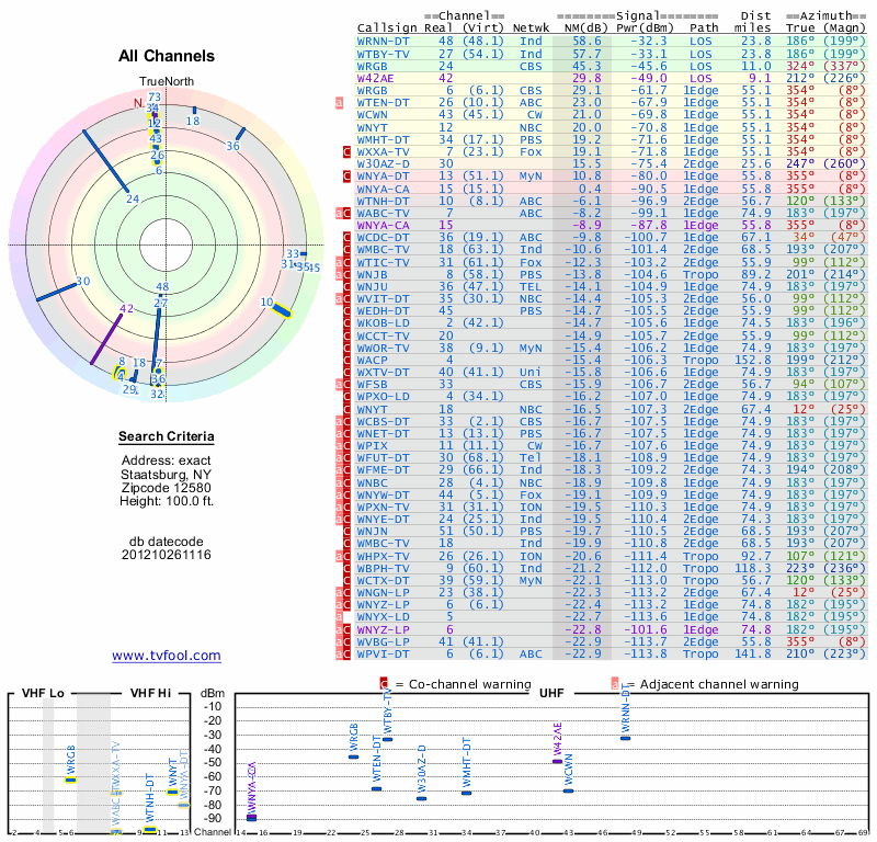 Here are the results for your location. The transmitter database was last updated on June 7, 2013. For more information about these plots and how to interpret them, please check out the Signal Analysis FAQ.