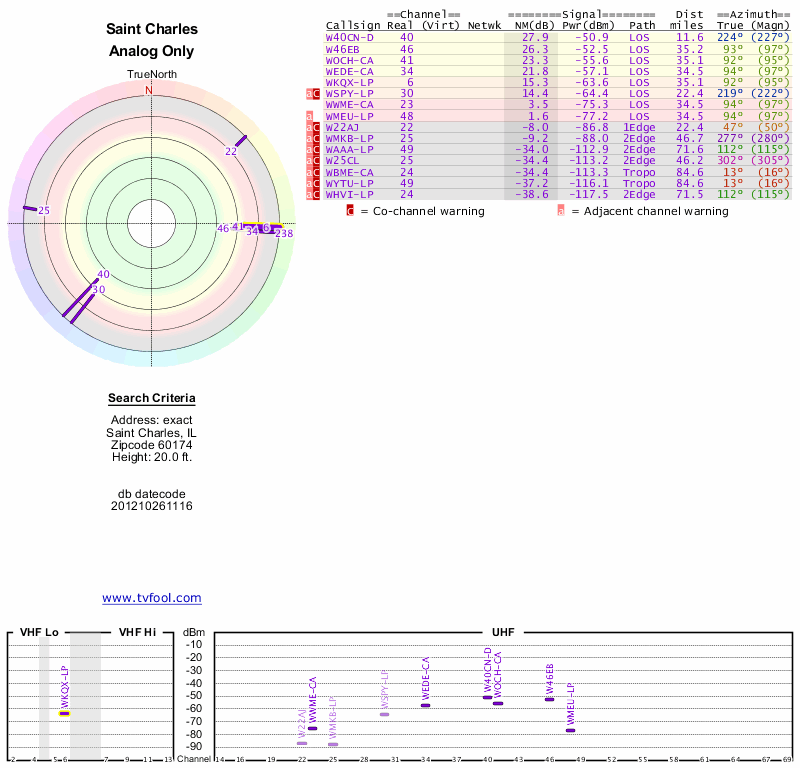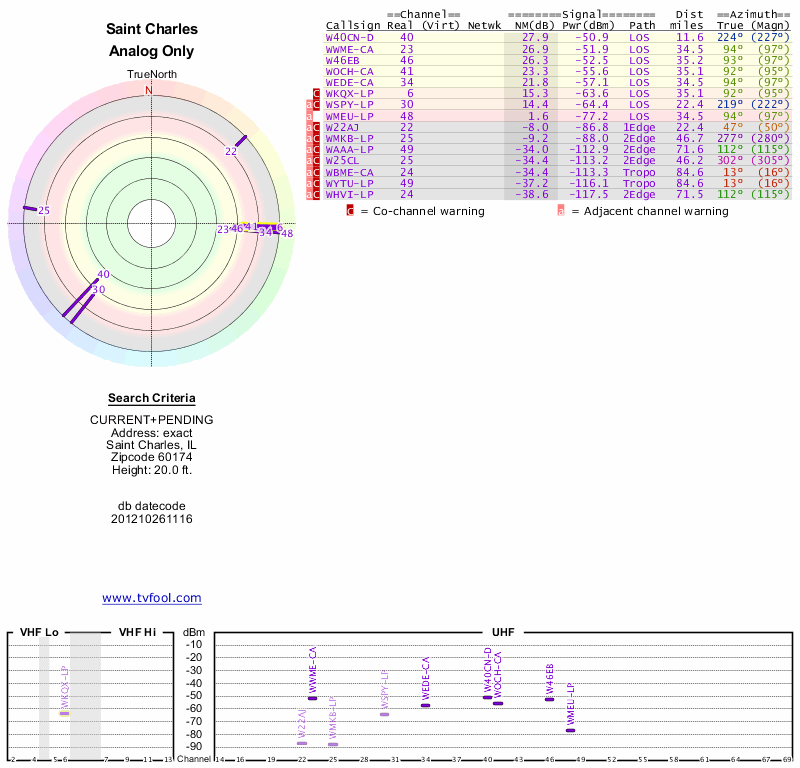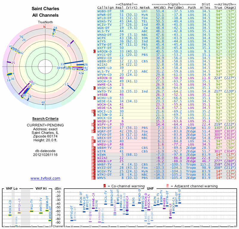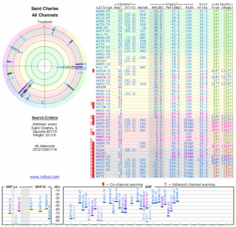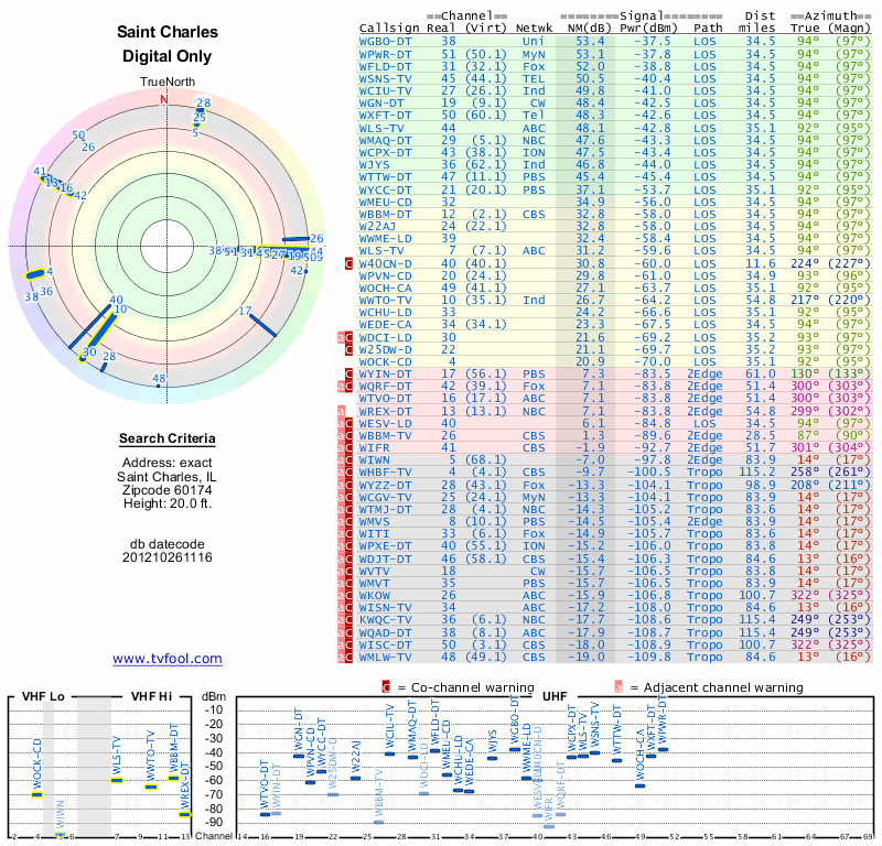 Here are the results for your location. The transmitter database was last updated on June 7, 2013. For more information about these plots and how to interpret them, please check out the Signal Analysis FAQ.