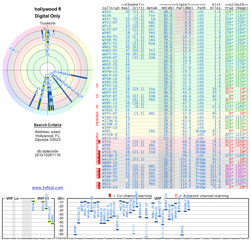 Here are the results for your location. The transmitter database was last updated on June 7, 2013. For more information about these plots and how to interpret them, please check out the Signal Analysis FAQ.
