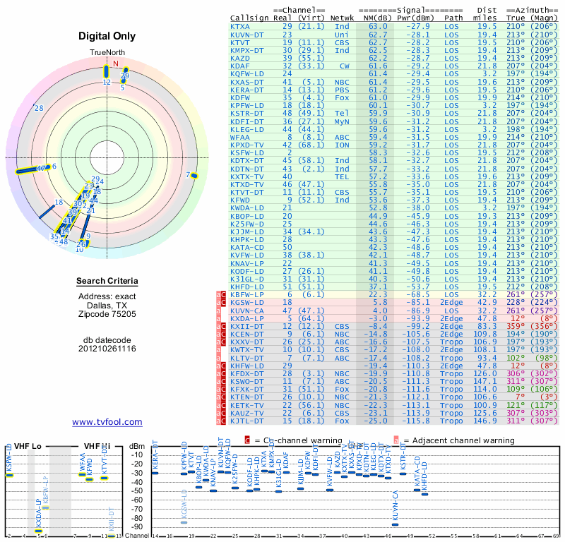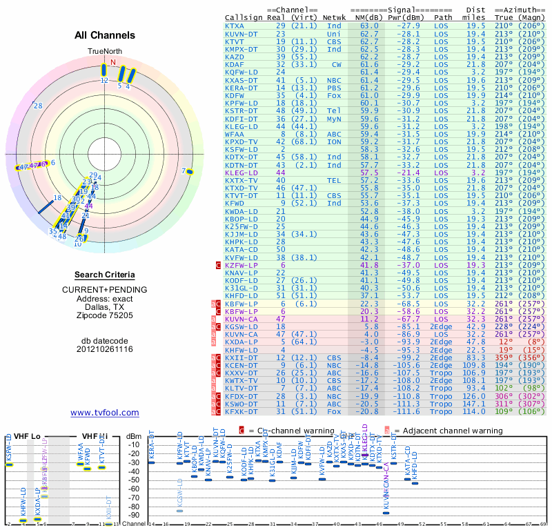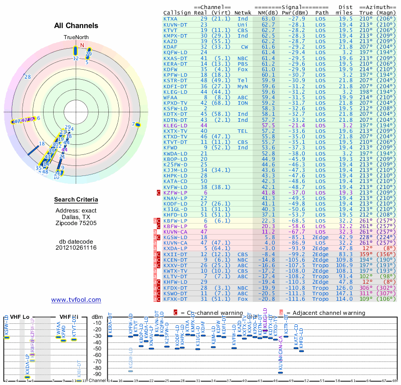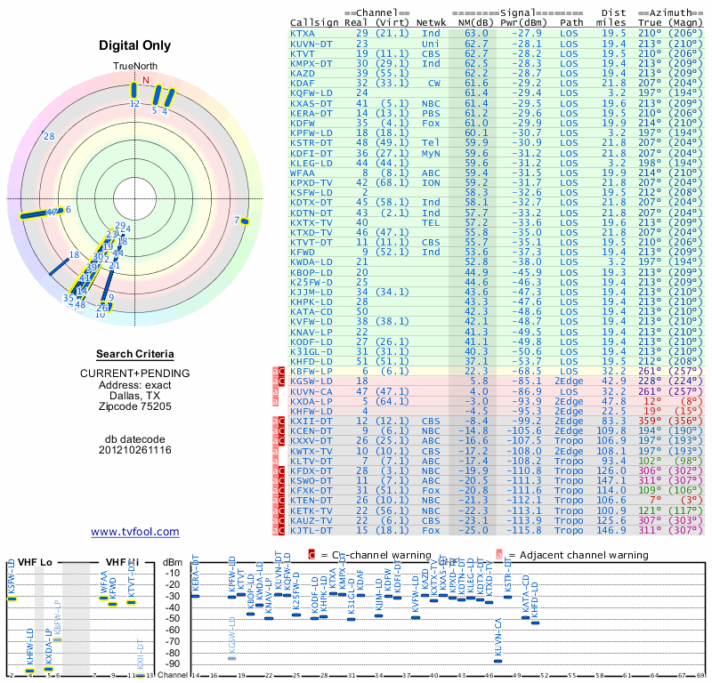 Here are the results for your location. The transmitter database was last updated on June 7, 2013. For more information about these plots and how to interpret them, please check out the Signal Analysis FAQ.