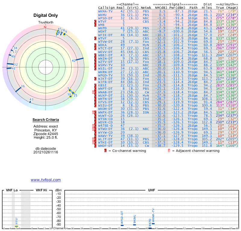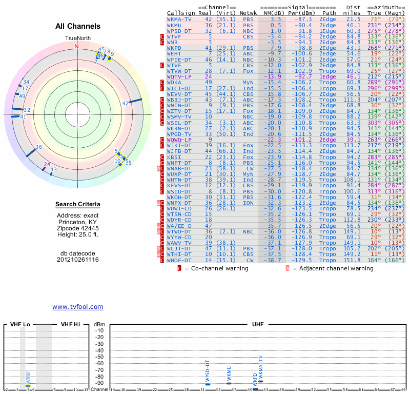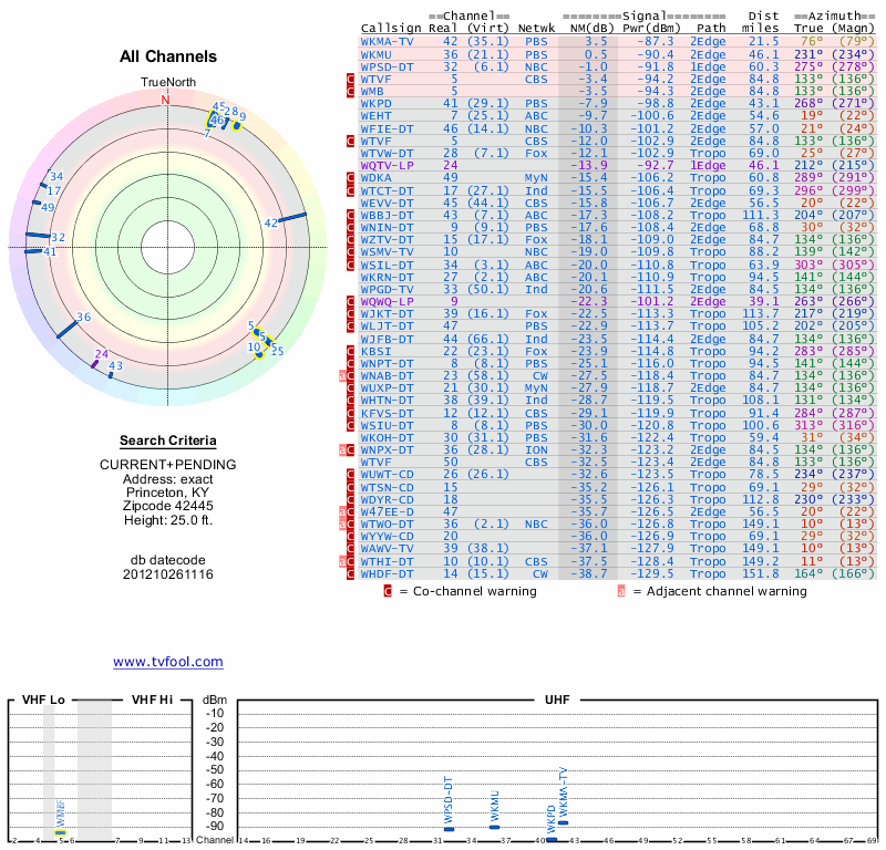 Here are the results for your location. The transmitter database was last updated on June 7, 2013. For more information about these plots and how to interpret them, please check out the Signal Analysis FAQ.
