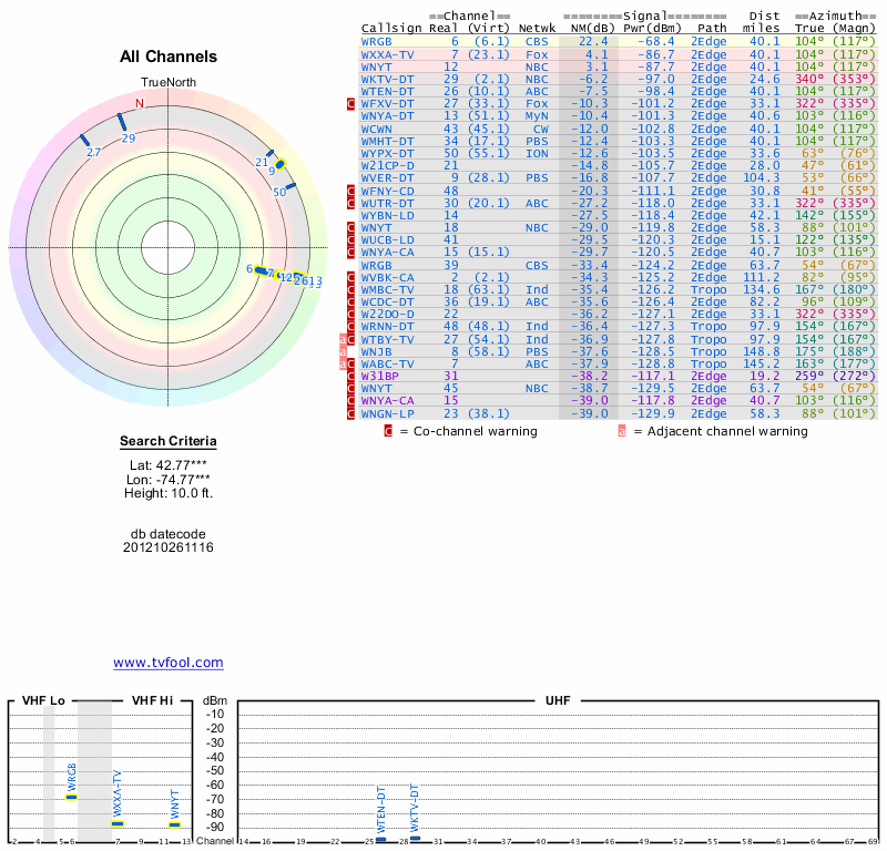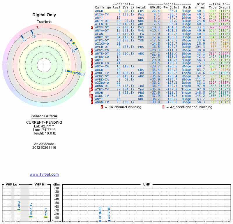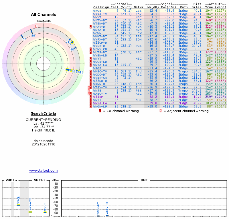 Here are the results for your location. The transmitter database was last updated on June 7, 2013. For more information about these plots and how to interpret them, please check out the Signal Analysis FAQ.