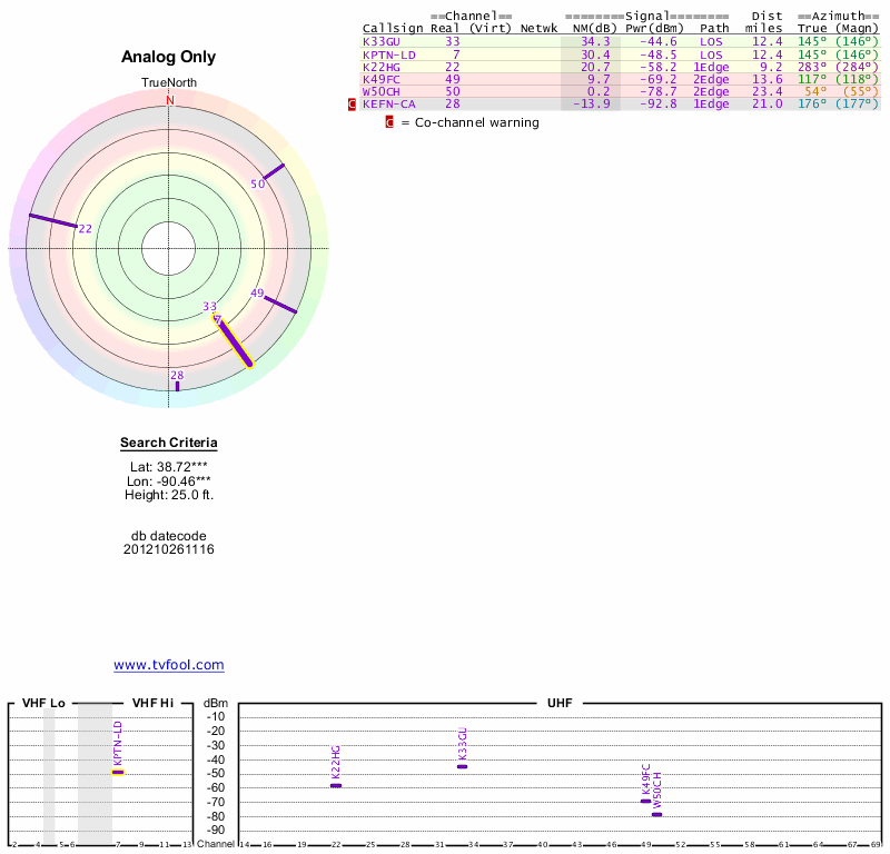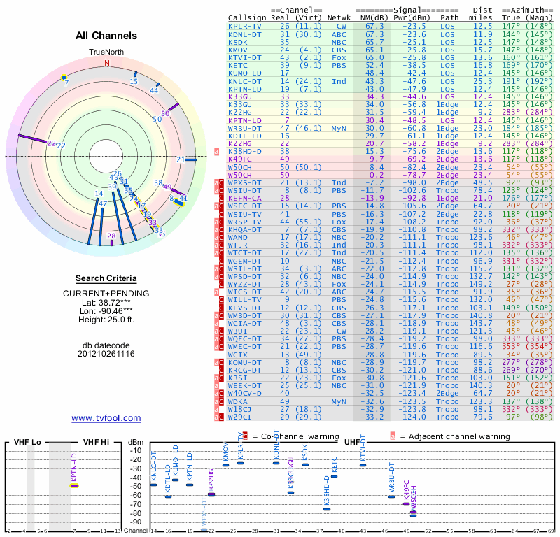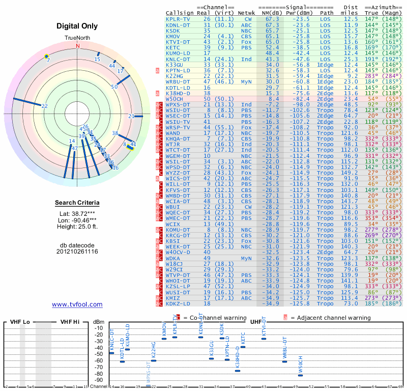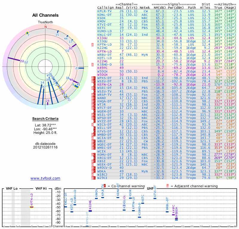 Here are the results for your location. The transmitter database was last updated on June 7, 2013. For more information about these plots and how to interpret them, please check out the Signal Analysis FAQ.