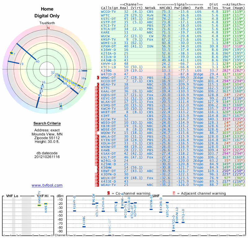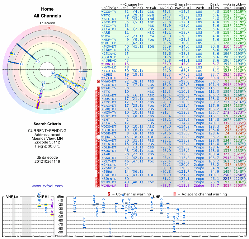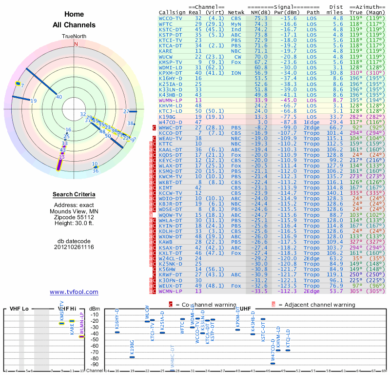Here are the results for your location. The transmitter database was last updated on June 7, 2013. For more information about these plots and how to interpret them, please check out the Signal Analysis FAQ.