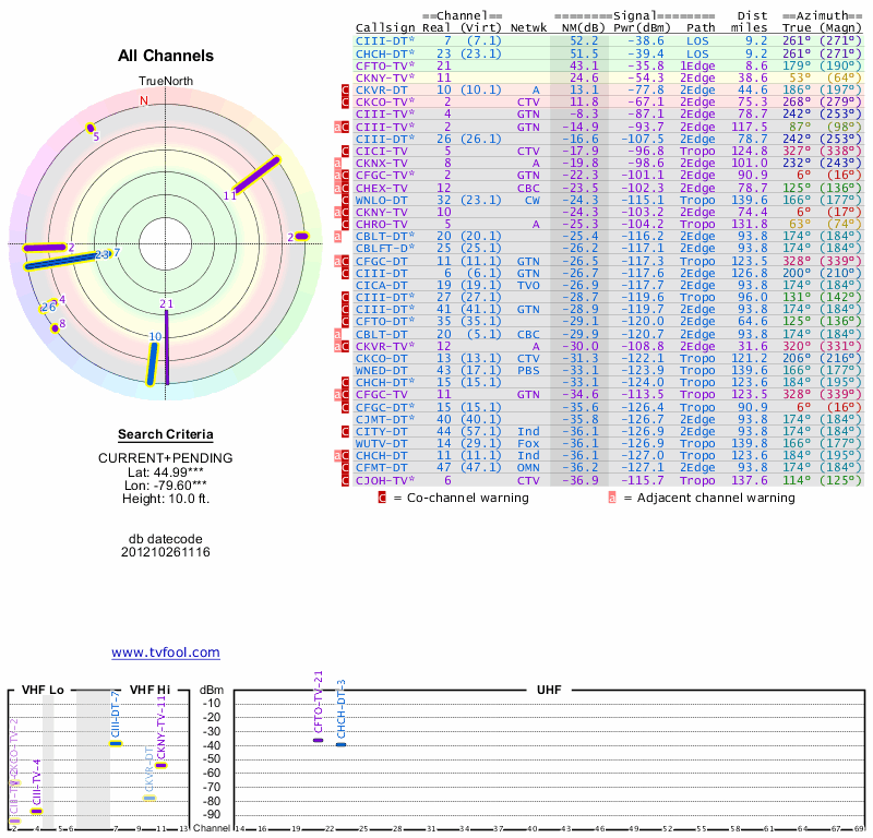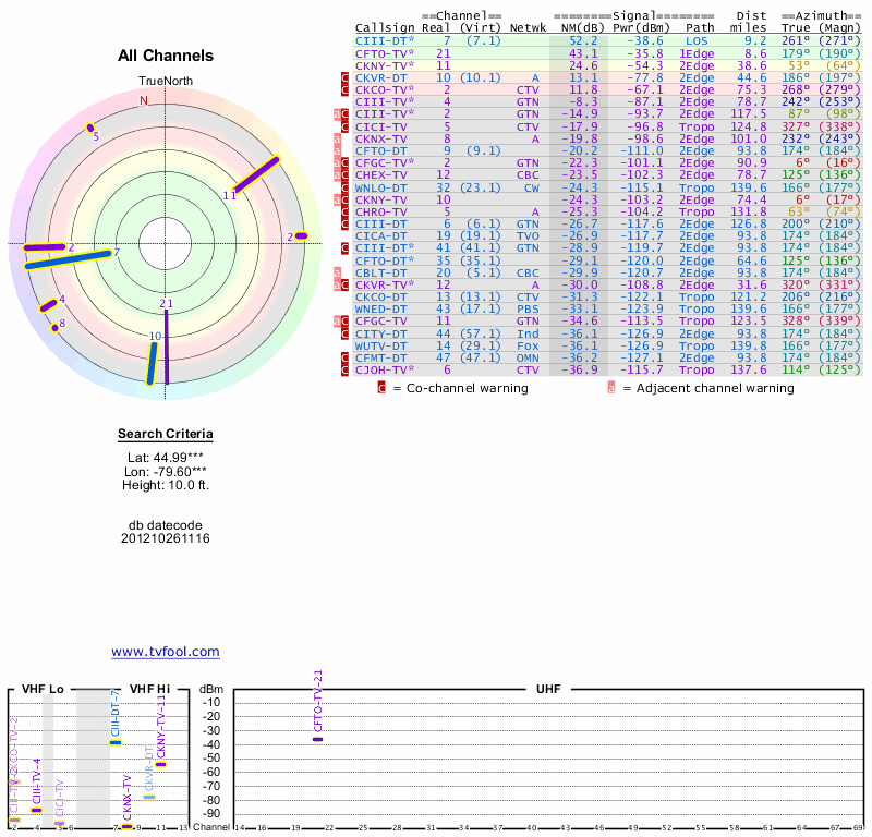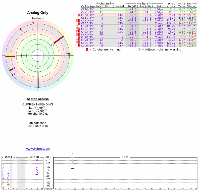 Here are the results for your location. The transmitter database was last updated on June 7, 2013. For more information about these plots and how to interpret them, please check out the Signal Analysis FAQ.
