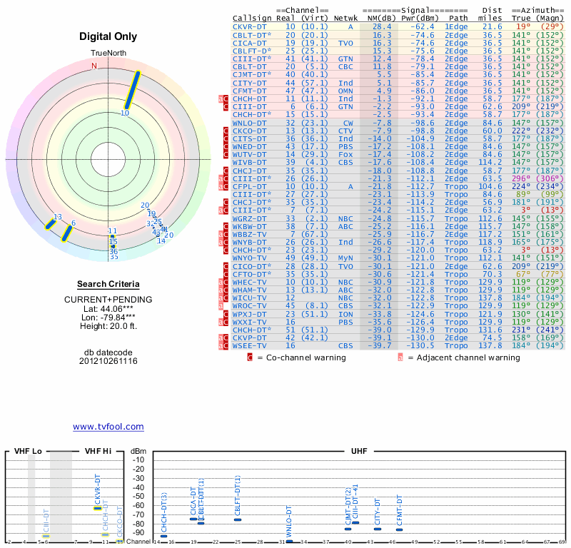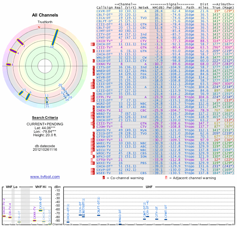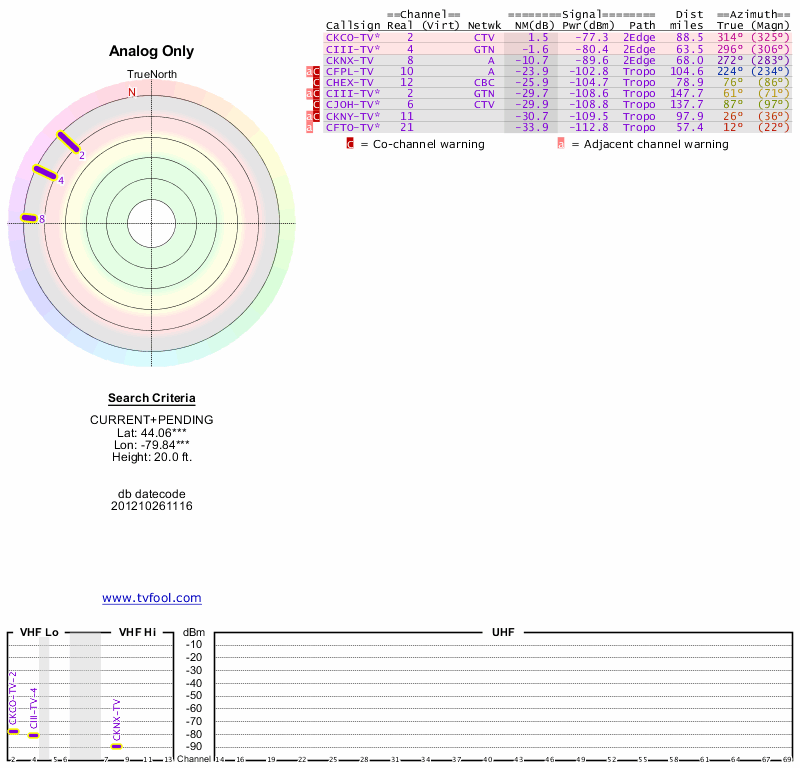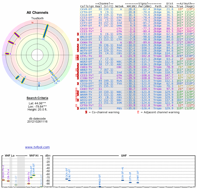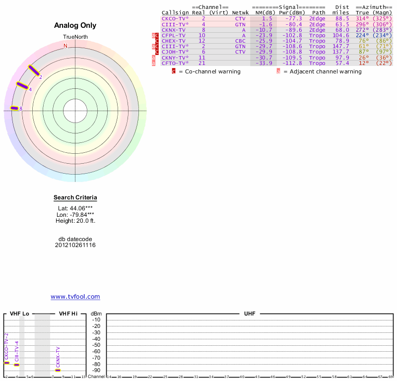 Here are the results for your location. The transmitter database was last updated on June 7, 2013. For more information about these plots and how to interpret them, please check out the Signal Analysis FAQ.