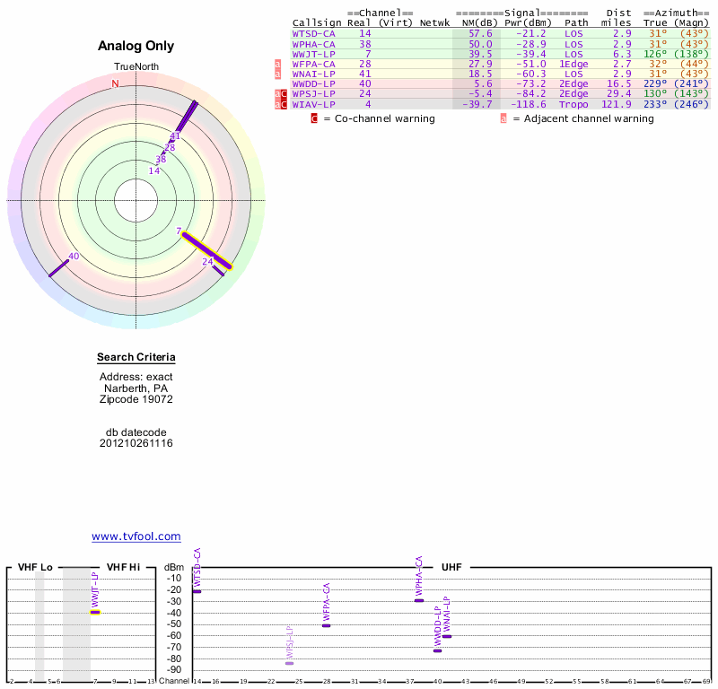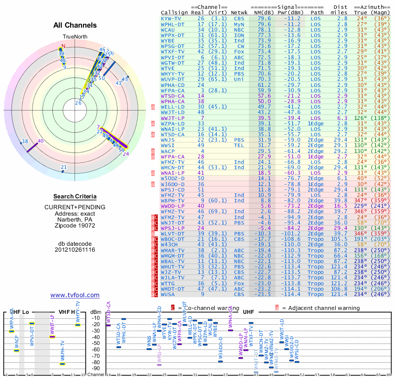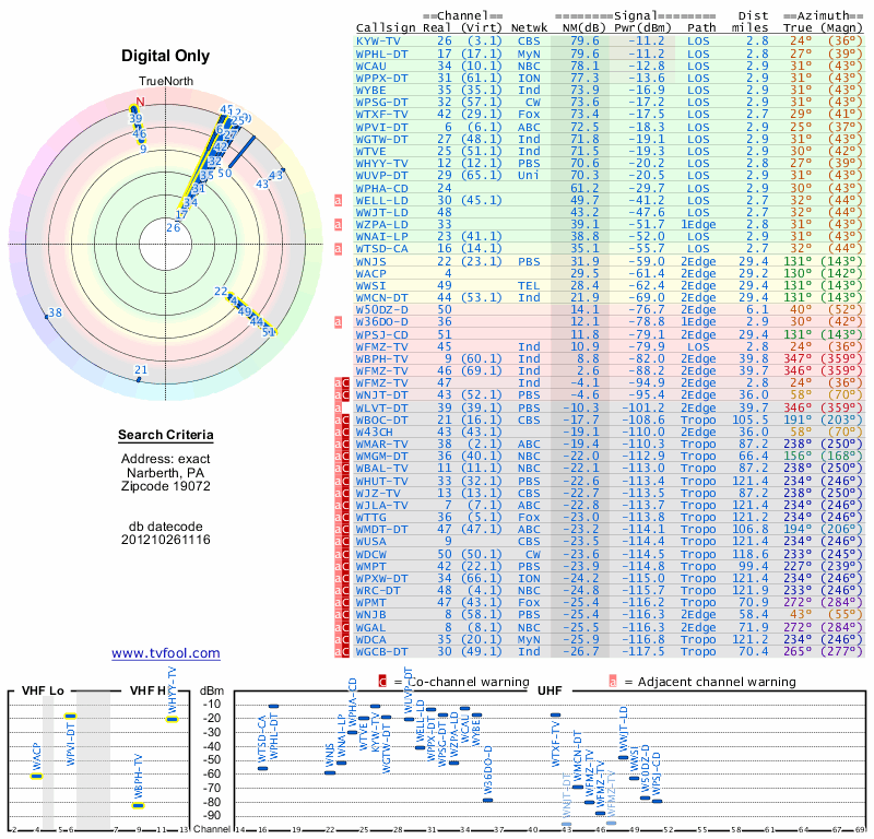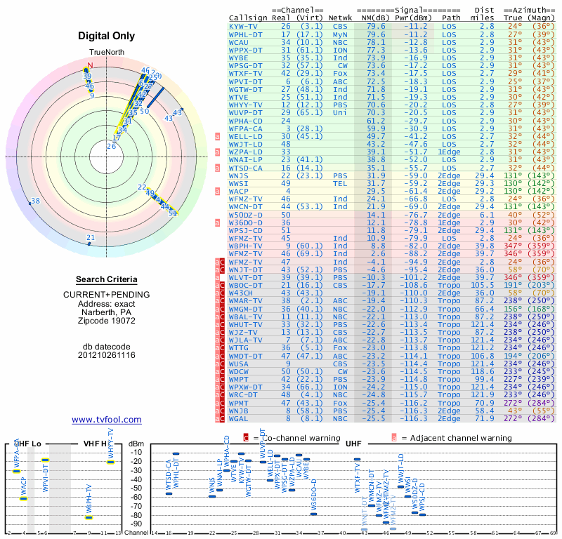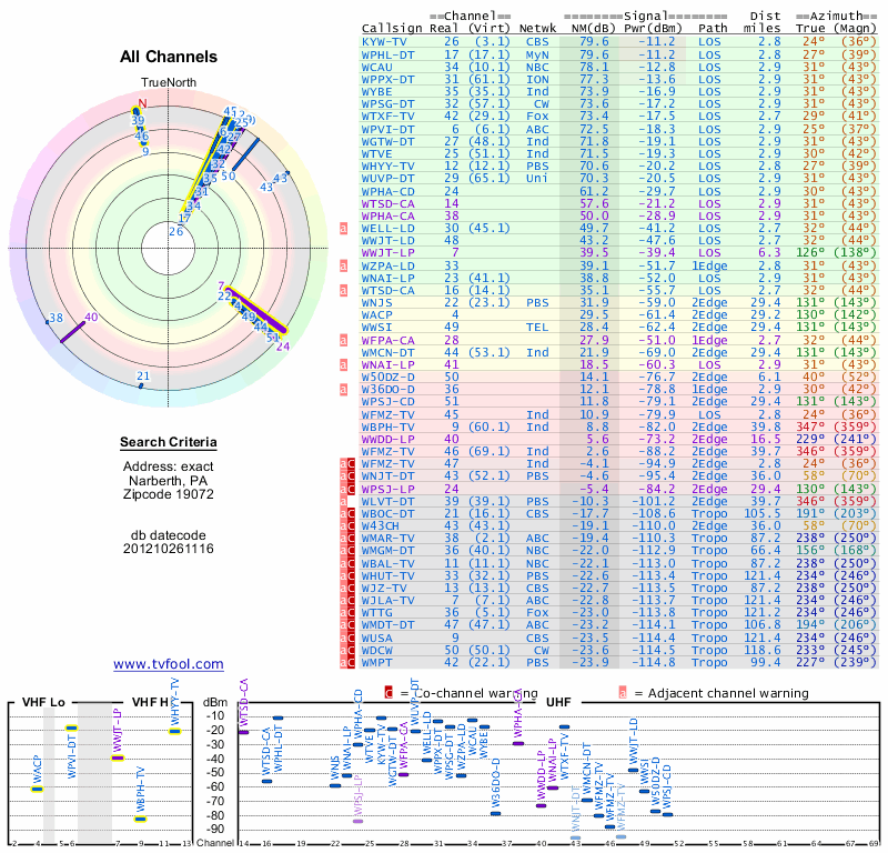 Here are the results for your location. The transmitter database was last updated on June 7, 2013. For more information about these plots and how to interpret them, please check out the Signal Analysis FAQ.