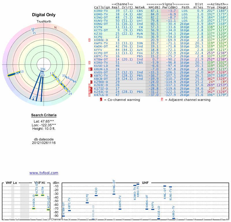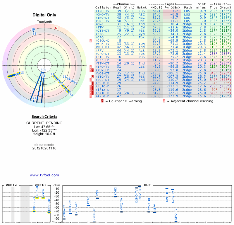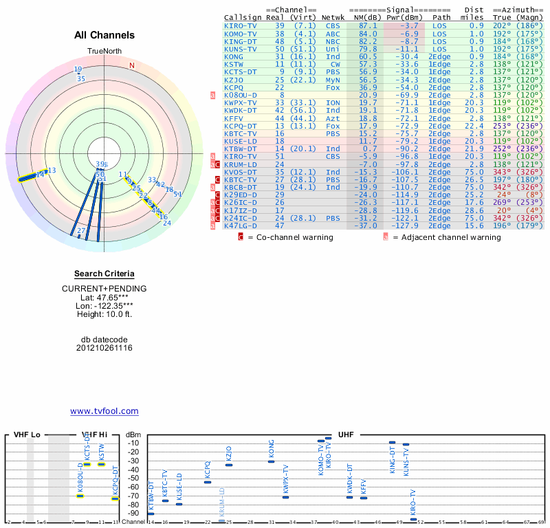 Here are the results for your location. The transmitter database was last updated on June 7, 2013. For more information about these plots and how to interpret them, please check out the Signal Analysis FAQ.