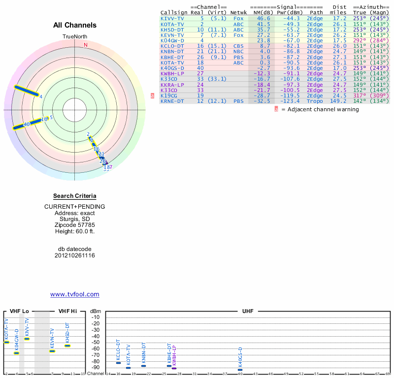 Here are the results for your location. The transmitter database was last updated on June 7, 2013. For more information about these plots and how to interpret them, please check out the Signal Analysis FAQ.