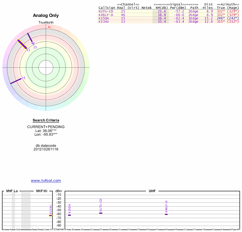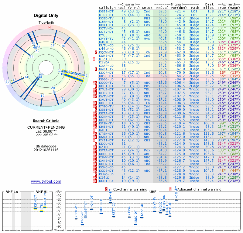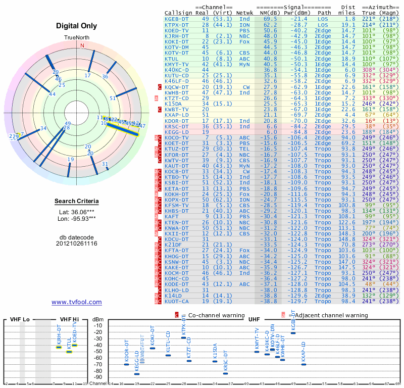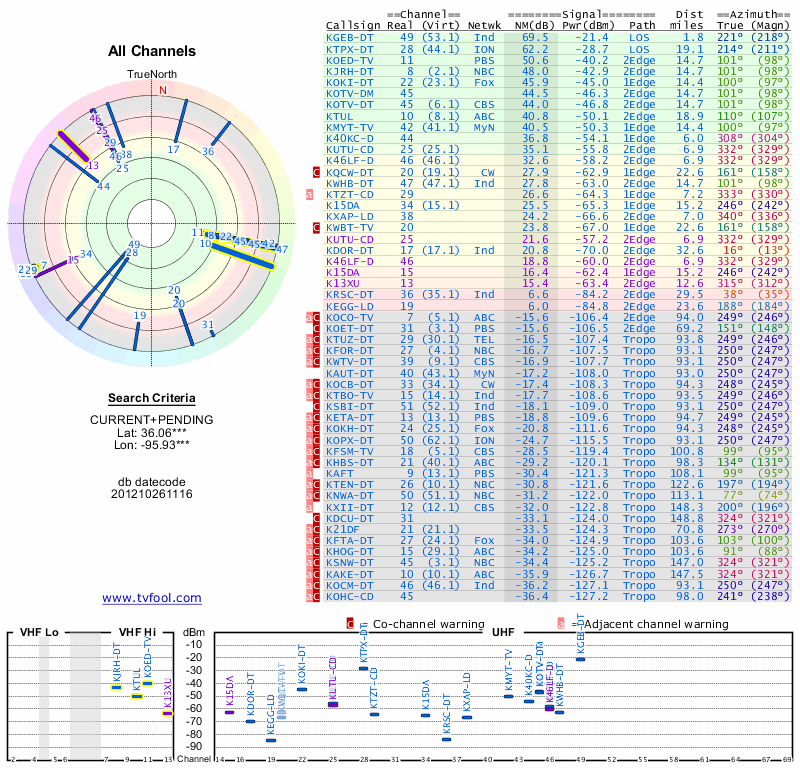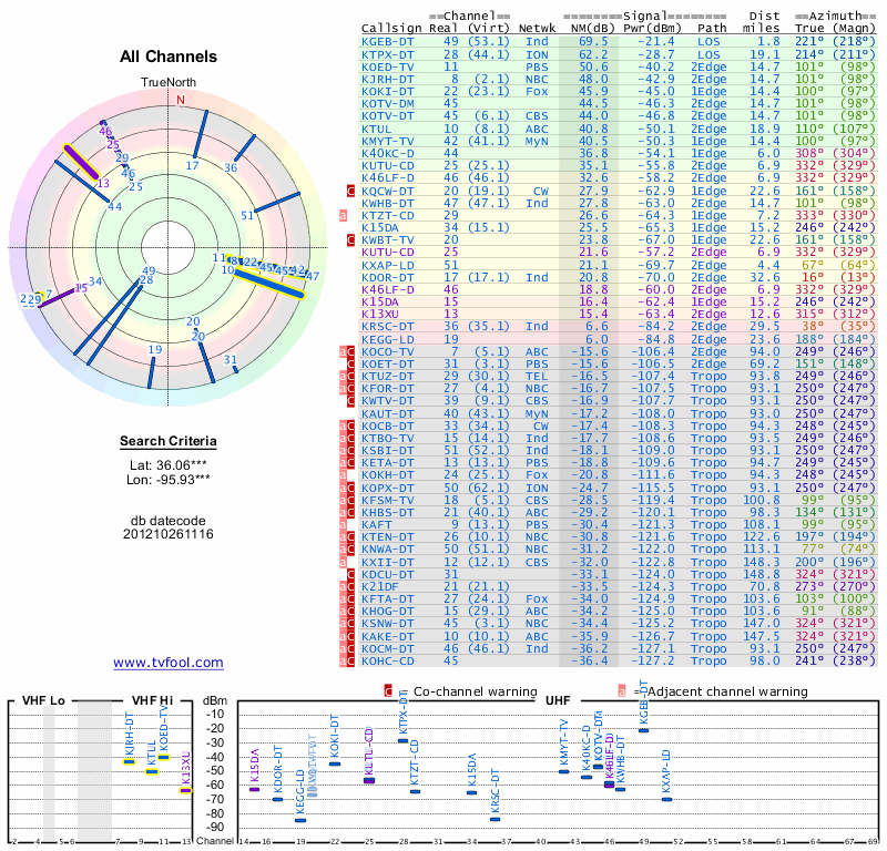 Here are the results for your location. The transmitter database was last updated on June 7, 2013. For more information about these plots and how to interpret them, please check out the Signal Analysis FAQ.