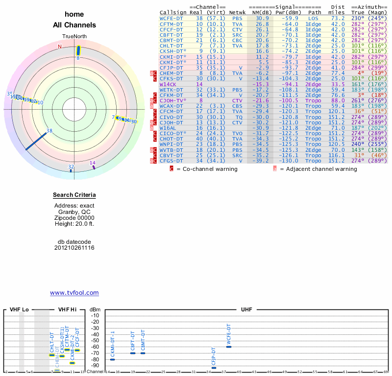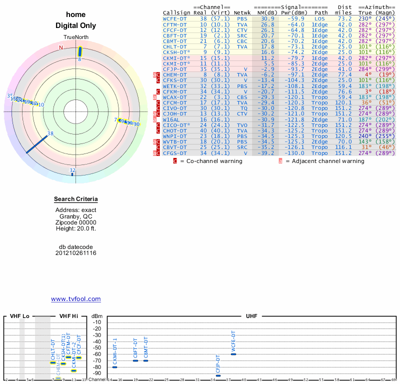 Here are the results for your location. The transmitter database was last updated on June 7, 2013. For more information about these plots and how to interpret them, please check out the Signal Analysis FAQ.