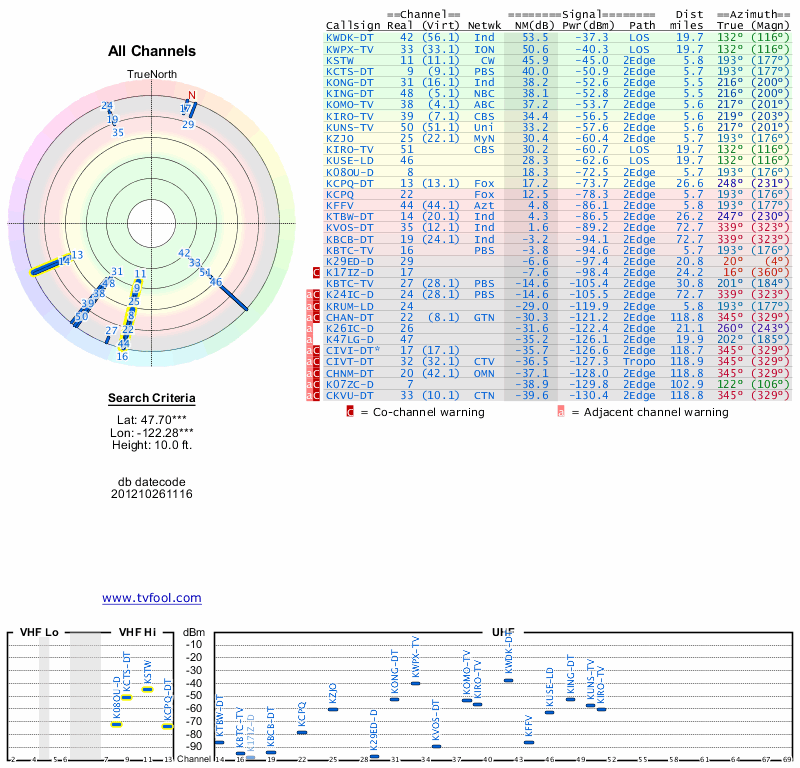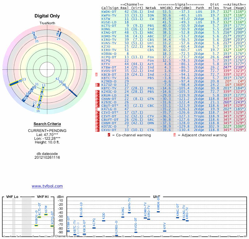 Here are the results for your location. The transmitter database was last updated on June 7, 2013. For more information about these plots and how to interpret them, please check out the Signal Analysis FAQ.