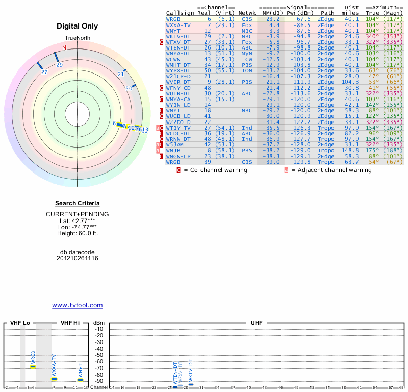 Here are the results for your location. The transmitter database was last updated on June 7, 2013. For more information about these plots and how to interpret them, please check out the Signal Analysis FAQ.