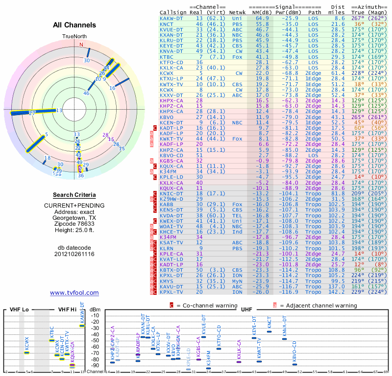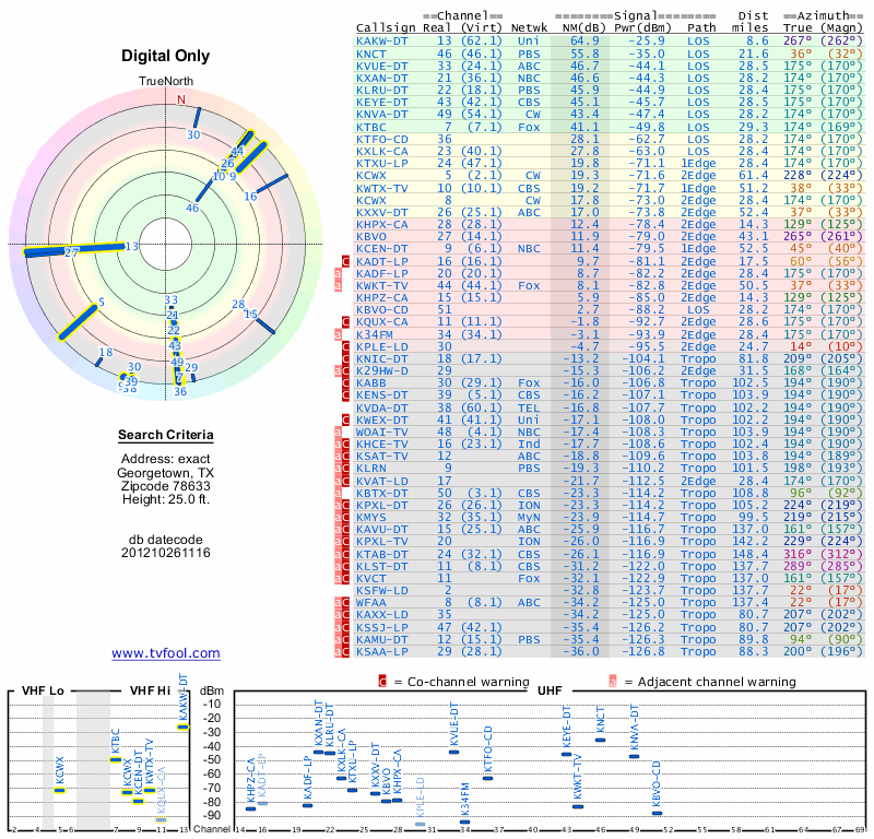 Here are the results for your location. The transmitter database was last updated on June 7, 2013. For more information about these plots and how to interpret them, please check out the Signal Analysis FAQ.