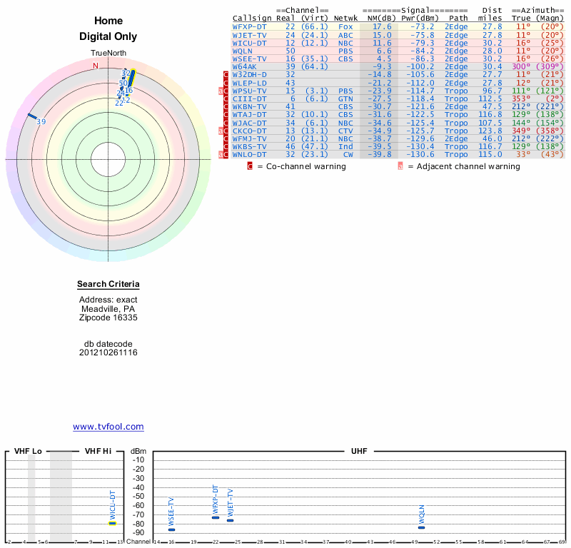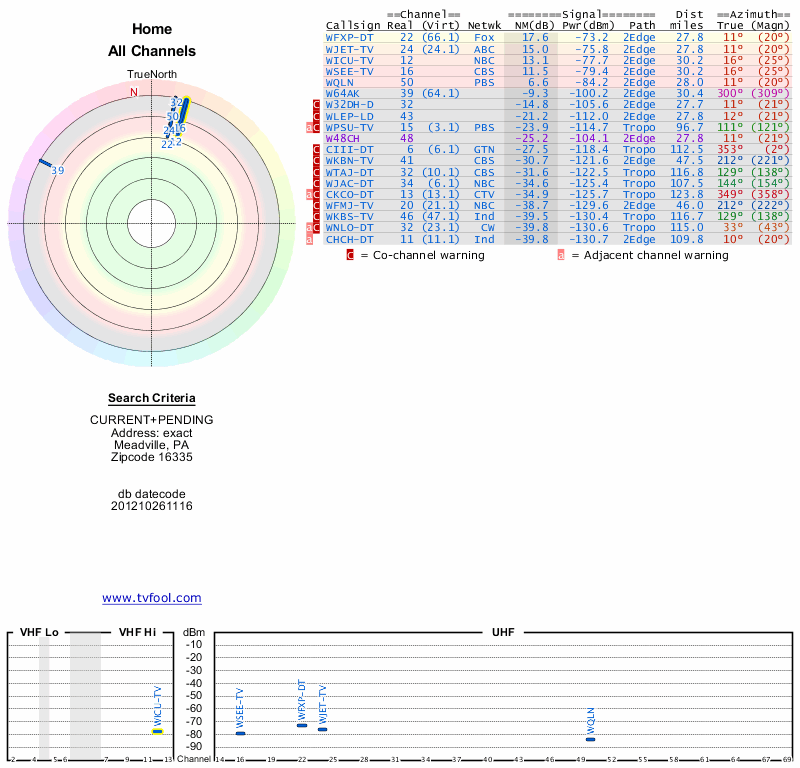 Here are the results for your location. The transmitter database was last updated on June 7, 2013. For more information about these plots and how to interpret them, please check out the Signal Analysis FAQ.