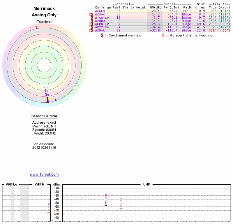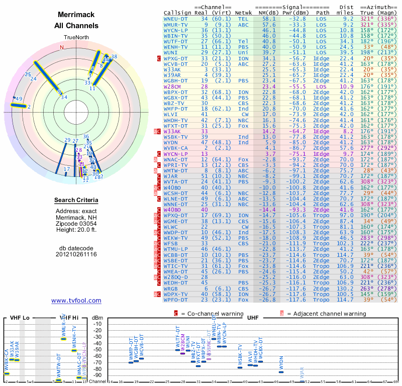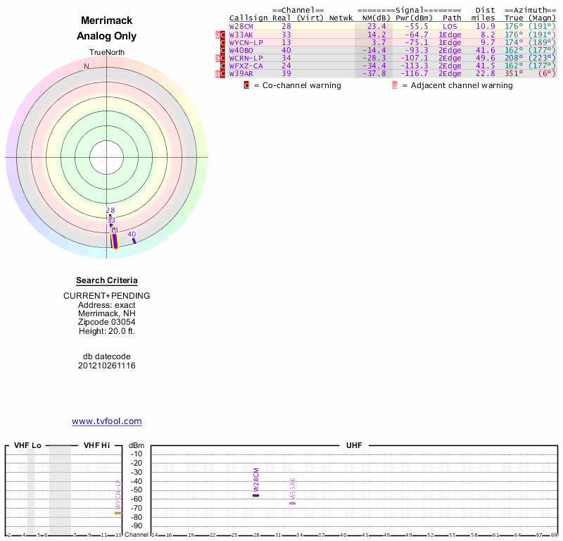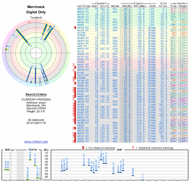 Here are the results for your location. The transmitter database was last updated on June 7, 2013. For more information about these plots and how to interpret them, please check out the Signal Analysis FAQ.