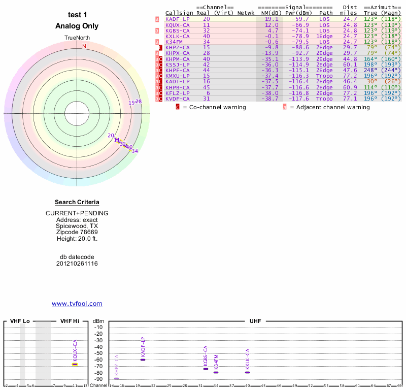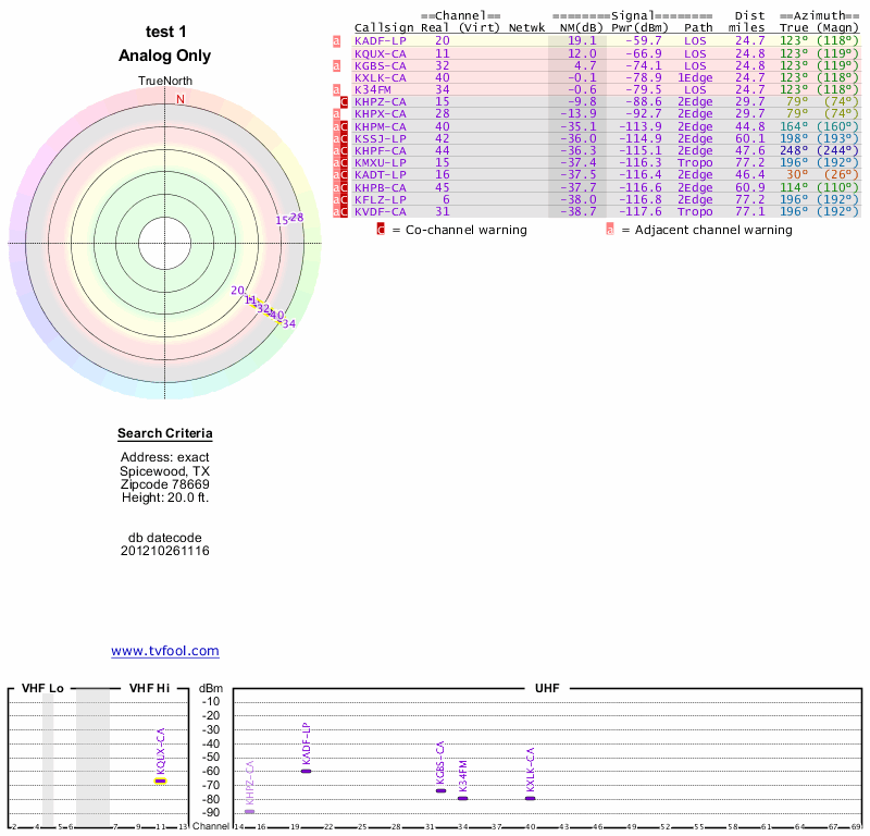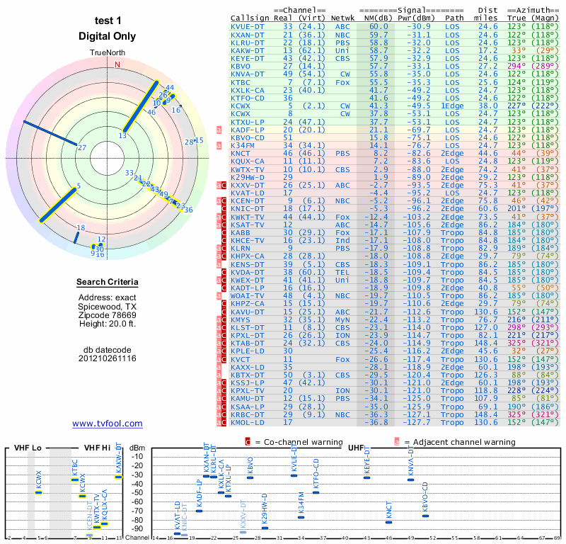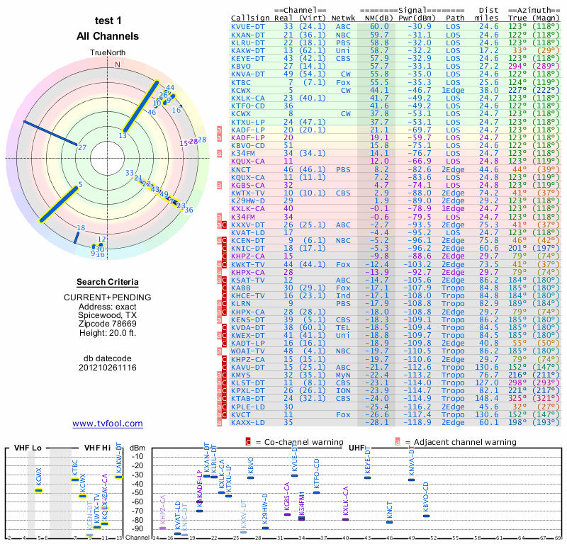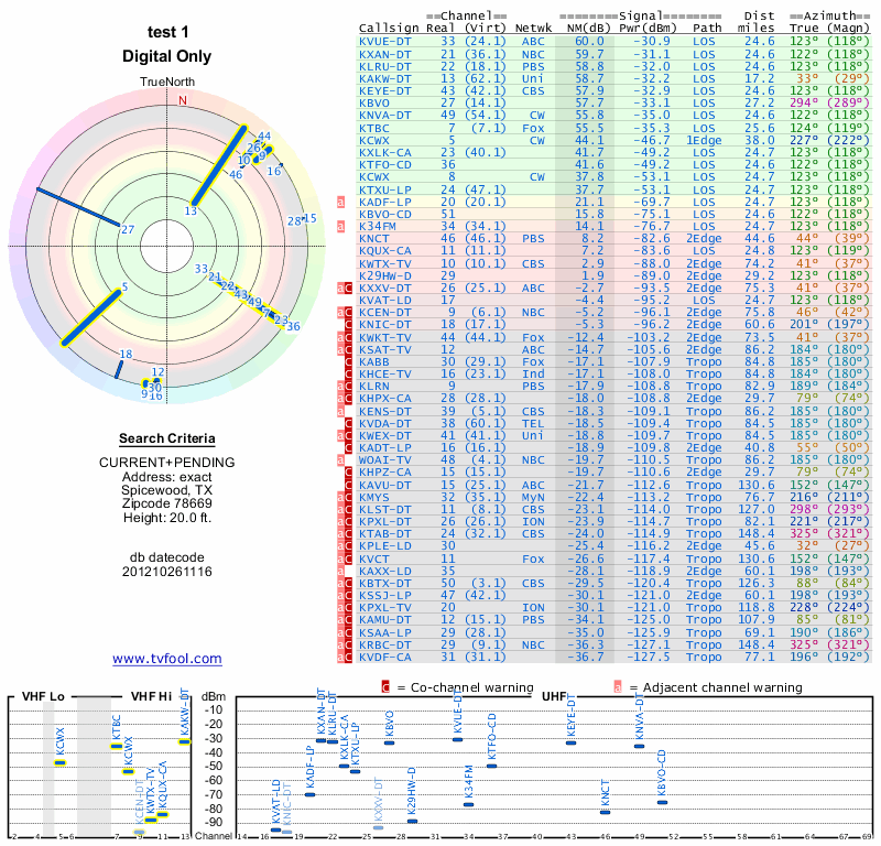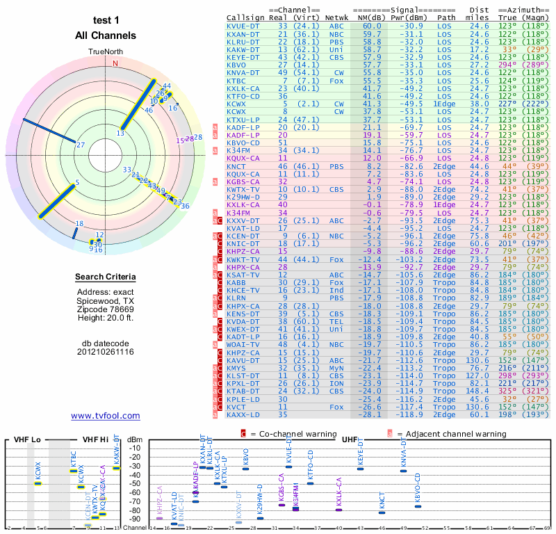 Here are the results for your location. The transmitter database was last updated on June 7, 2013. For more information about these plots and how to interpret them, please check out the Signal Analysis FAQ.