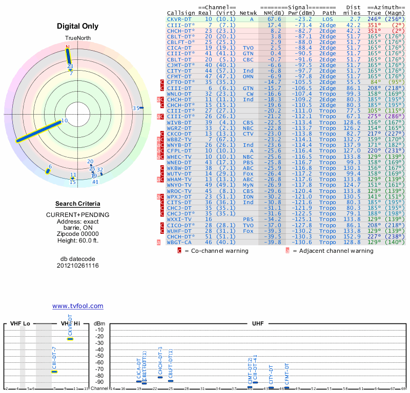 Here are the results for your location. The transmitter database was last updated on June 7, 2013. For more information about these plots and how to interpret them, please check out the Signal Analysis FAQ.