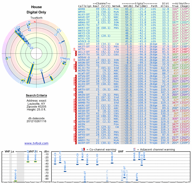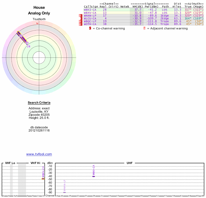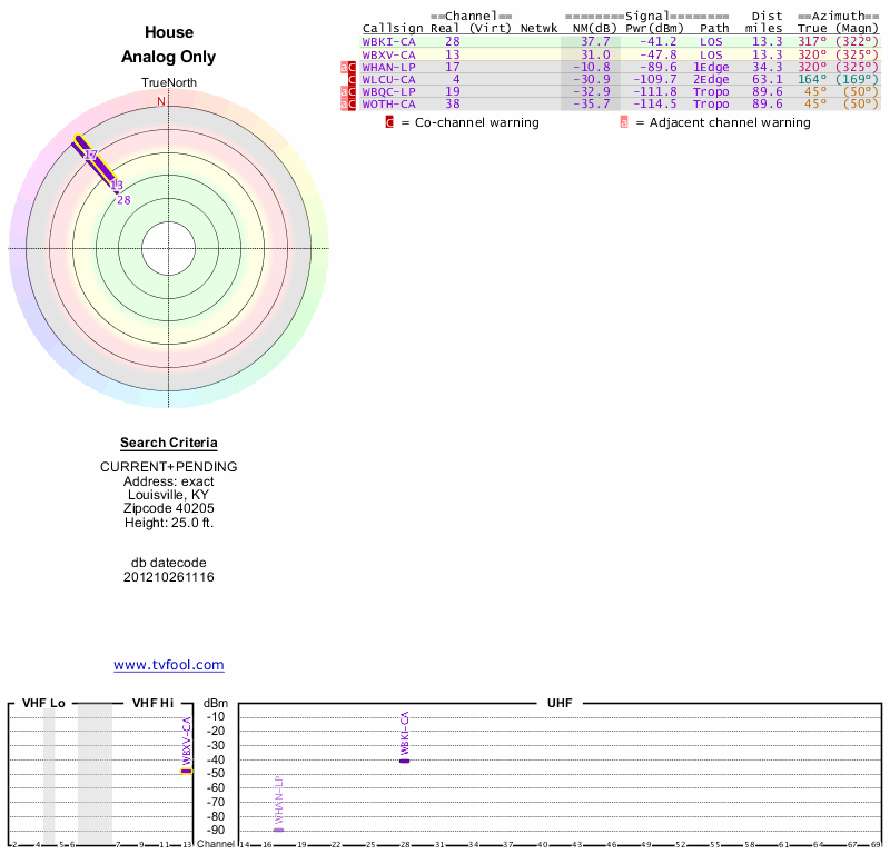 Here are the results for your location. The transmitter database was last updated on June 7, 2013. For more information about these plots and how to interpret them, please check out the Signal Analysis FAQ.