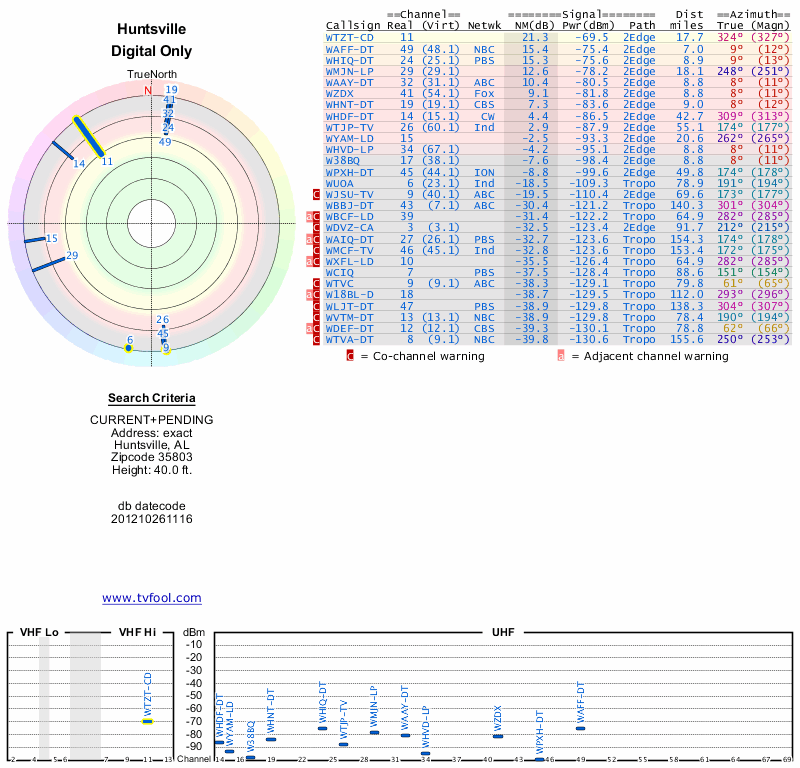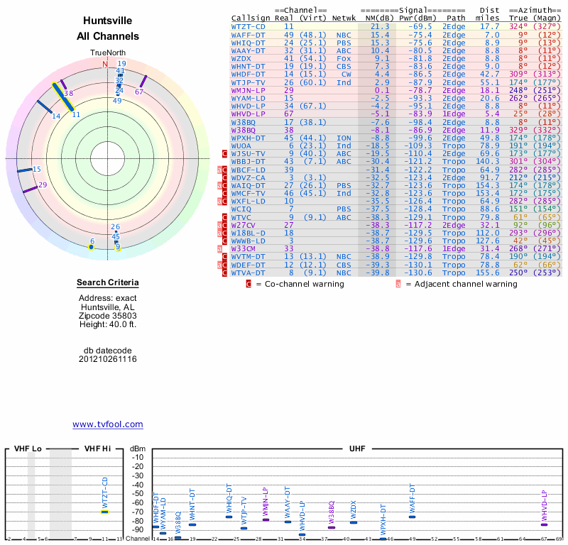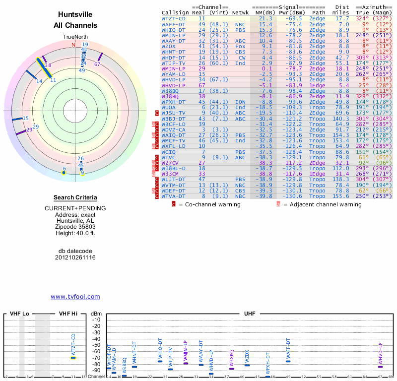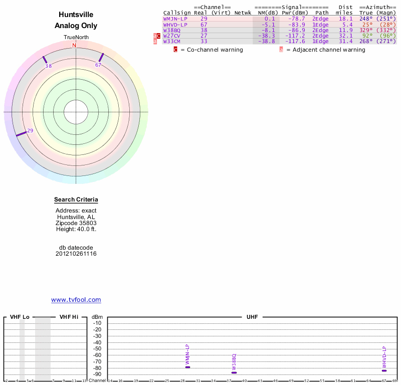 Here are the results for your location. The transmitter database was last updated on June 7, 2013. For more information about these plots and how to interpret them, please check out the Signal Analysis FAQ.