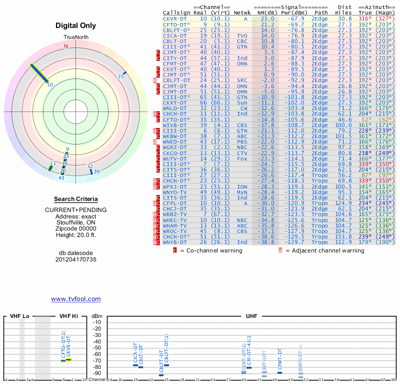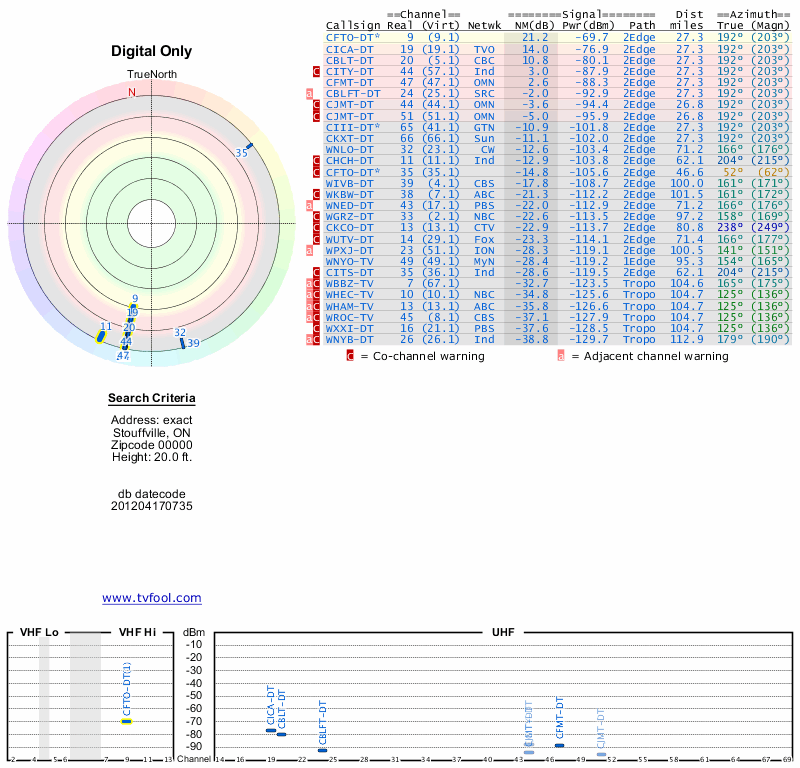 Here are the results for your location. The transmitter database was last updated on June 7, 2013. For more information about these plots and how to interpret them, please check out the Signal Analysis FAQ.