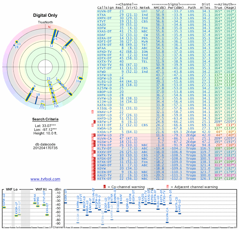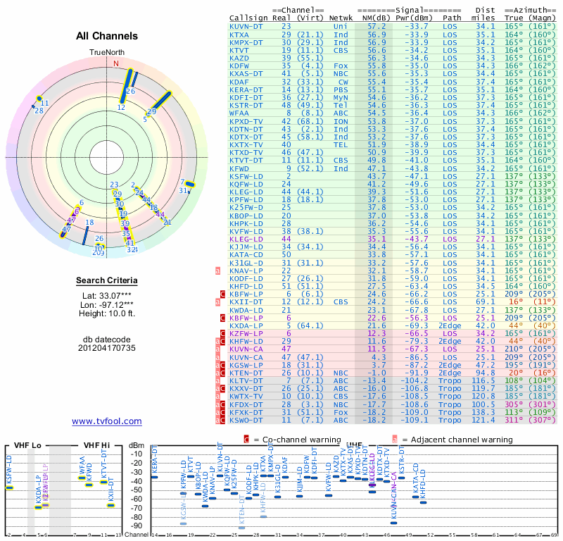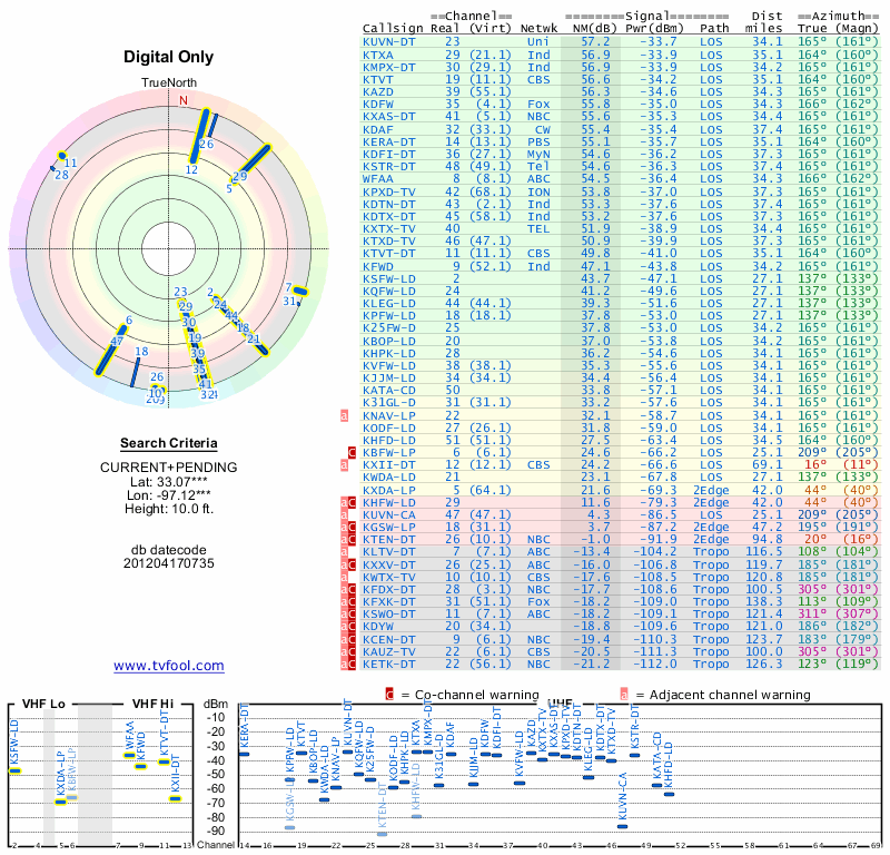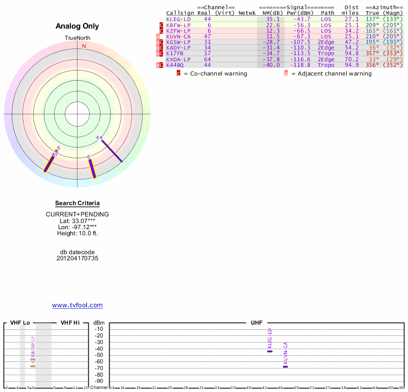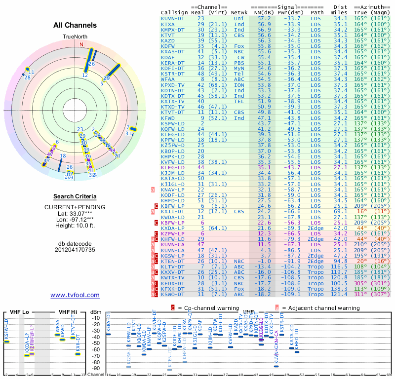 Here are the results for your location. The transmitter database was last updated on June 7, 2013. For more information about these plots and how to interpret them, please check out the Signal Analysis FAQ.