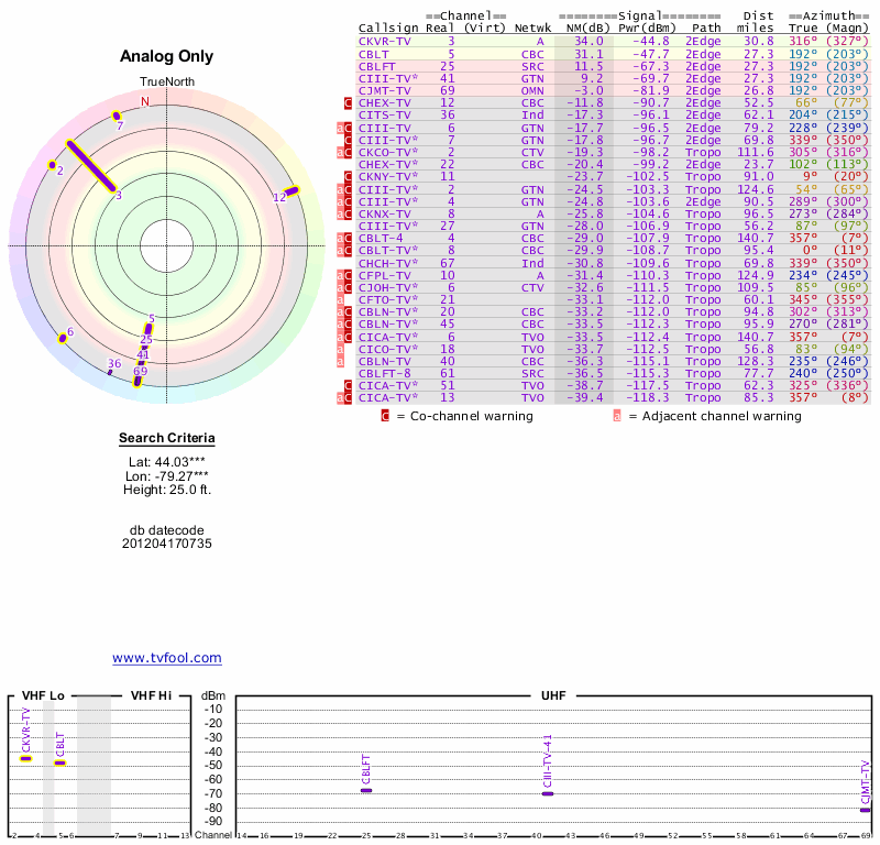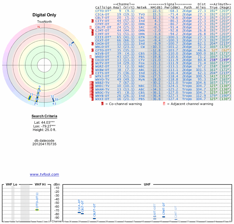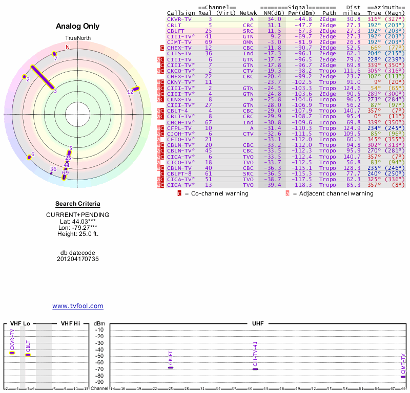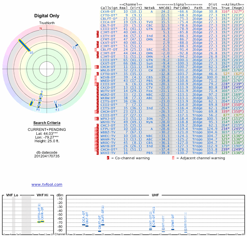 Here are the results for your location. The transmitter database was last updated on June 7, 2013. For more information about these plots and how to interpret them, please check out the Signal Analysis FAQ.
