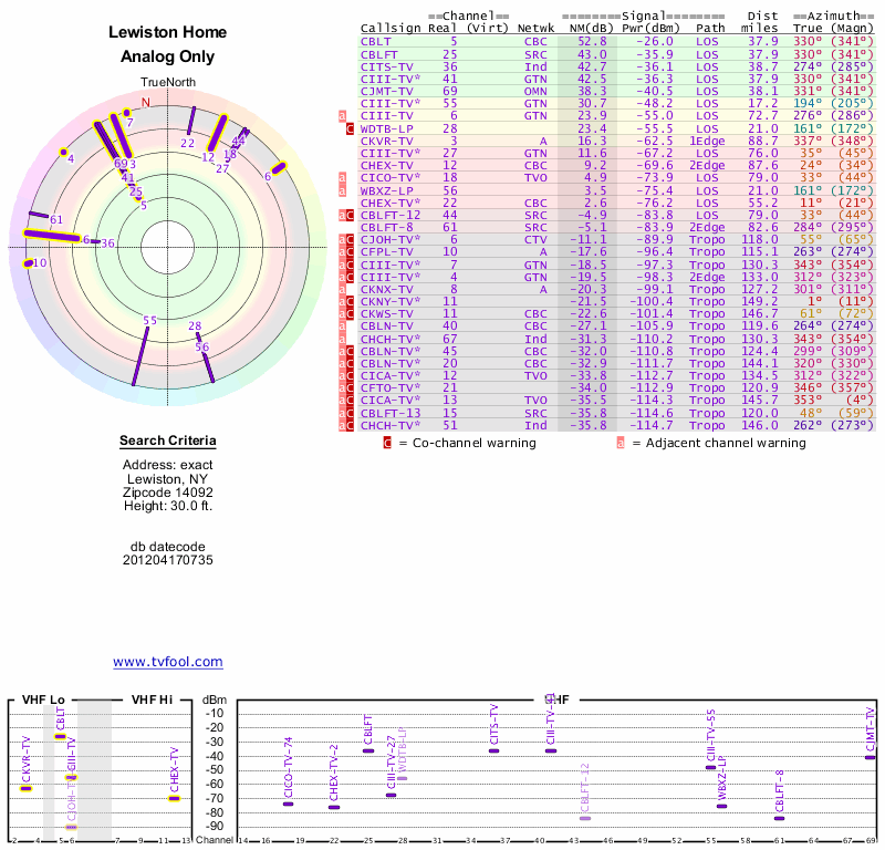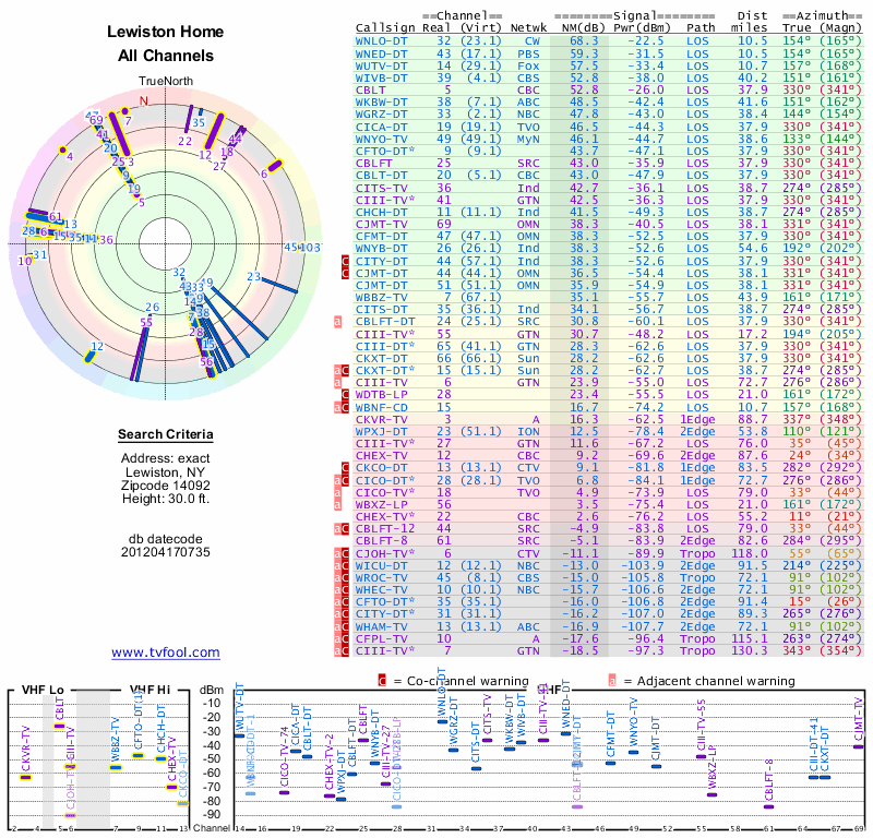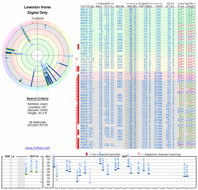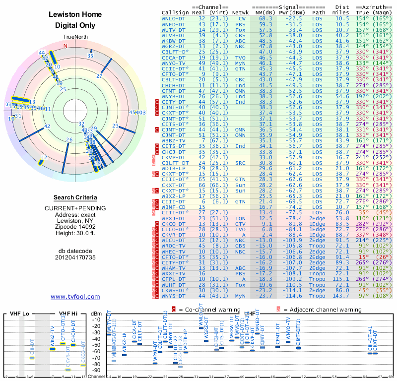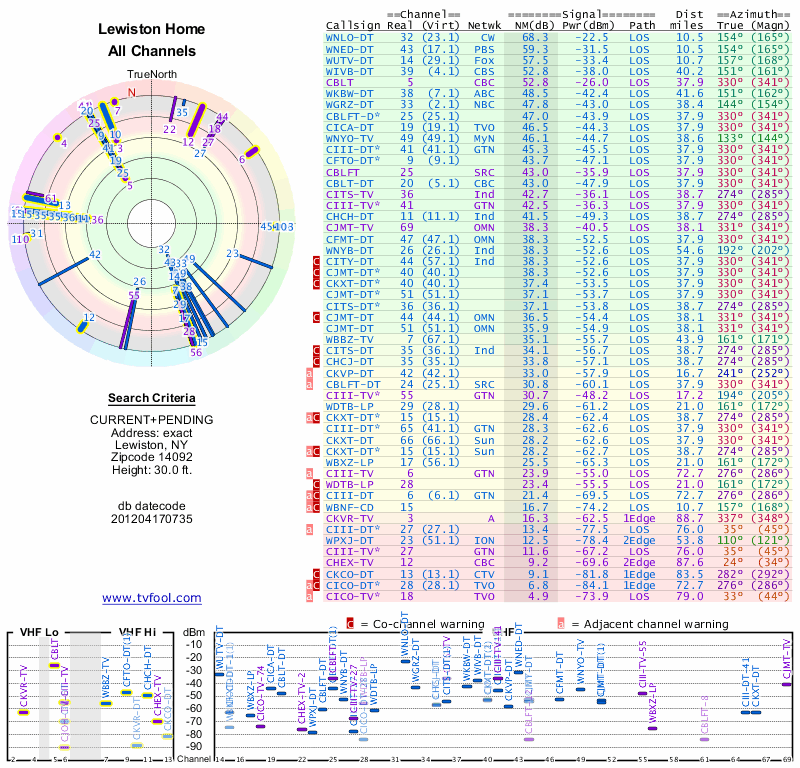 Here are the results for your location. The transmitter database was last updated on June 7, 2013. For more information about these plots and how to interpret them, please check out the Signal Analysis FAQ.