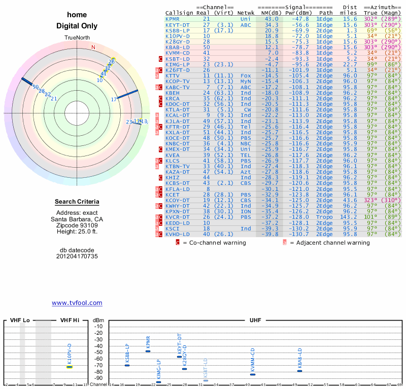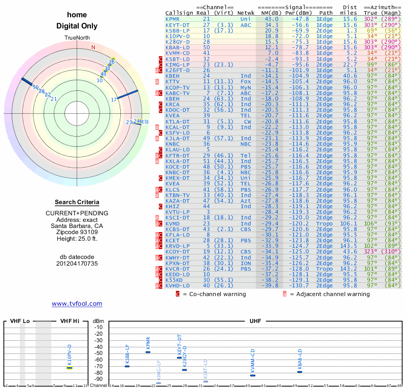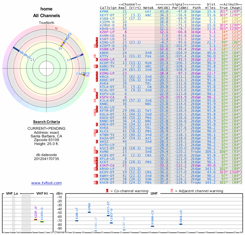 Here are the results for your location. The transmitter database was last updated on June 7, 2013. For more information about these plots and how to interpret them, please check out the Signal Analysis FAQ.