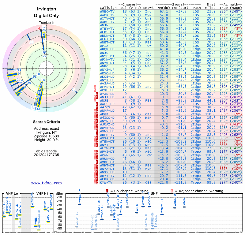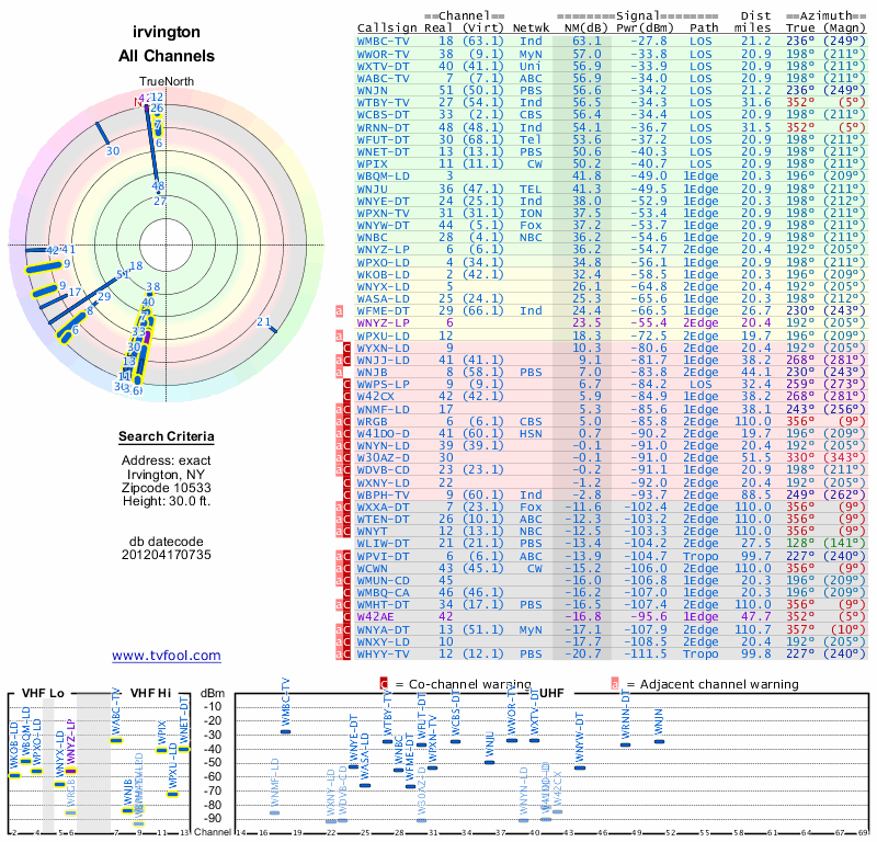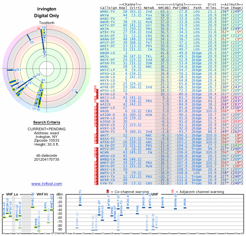 Here are the results for your location. The transmitter database was last updated on June 7, 2013. For more information about these plots and how to interpret them, please check out the Signal Analysis FAQ.