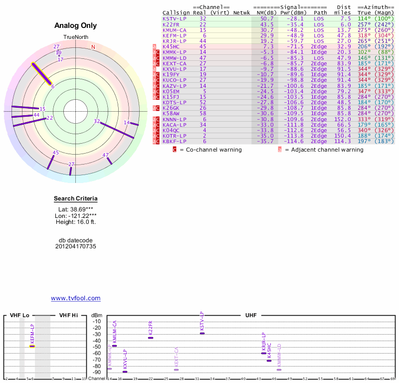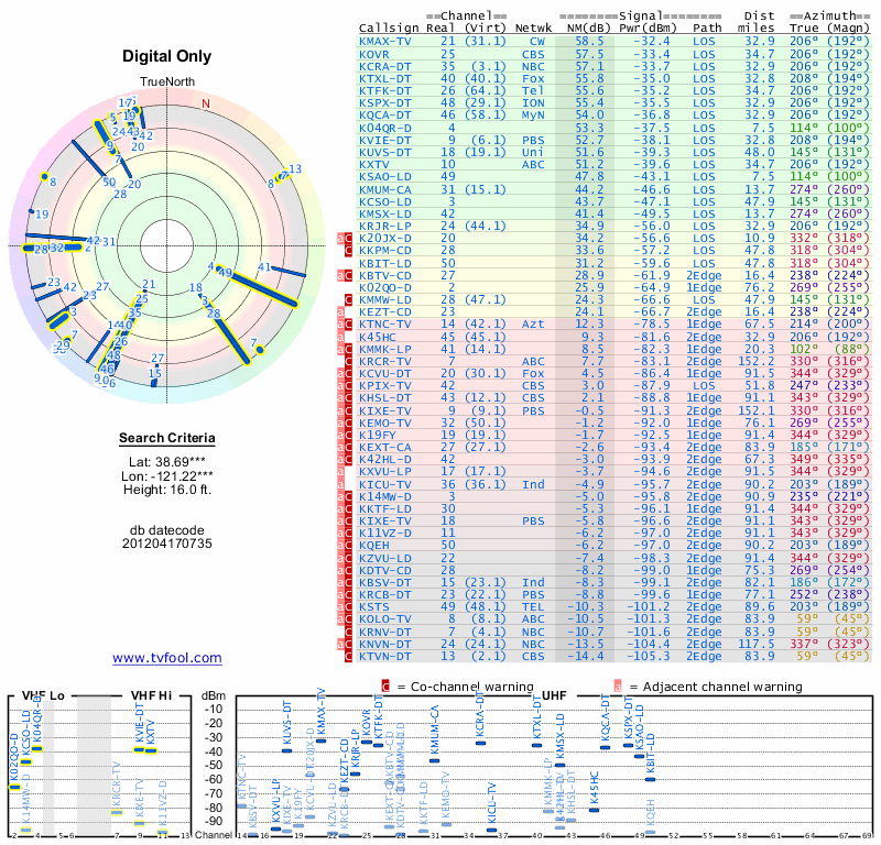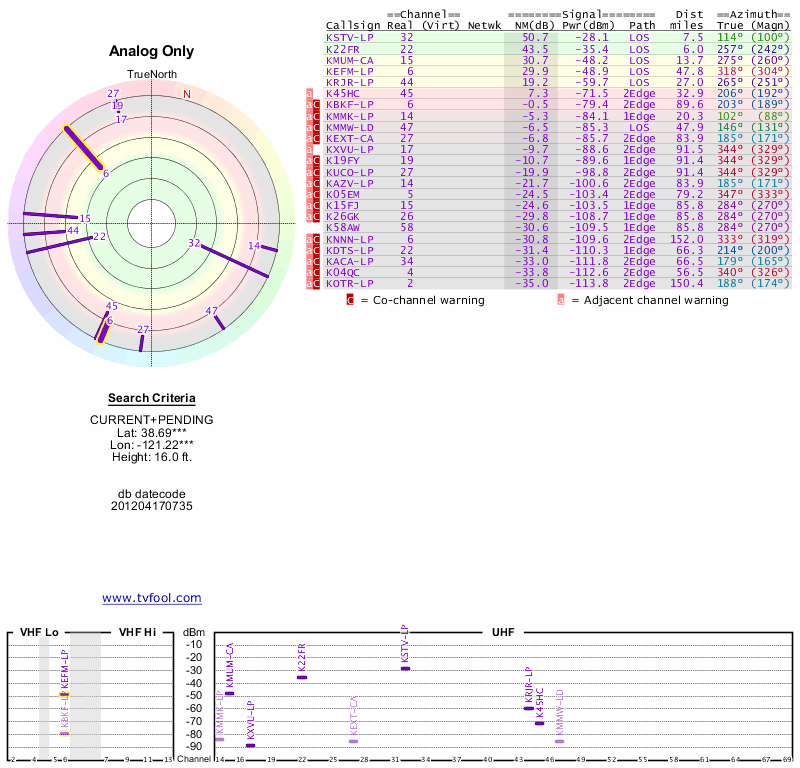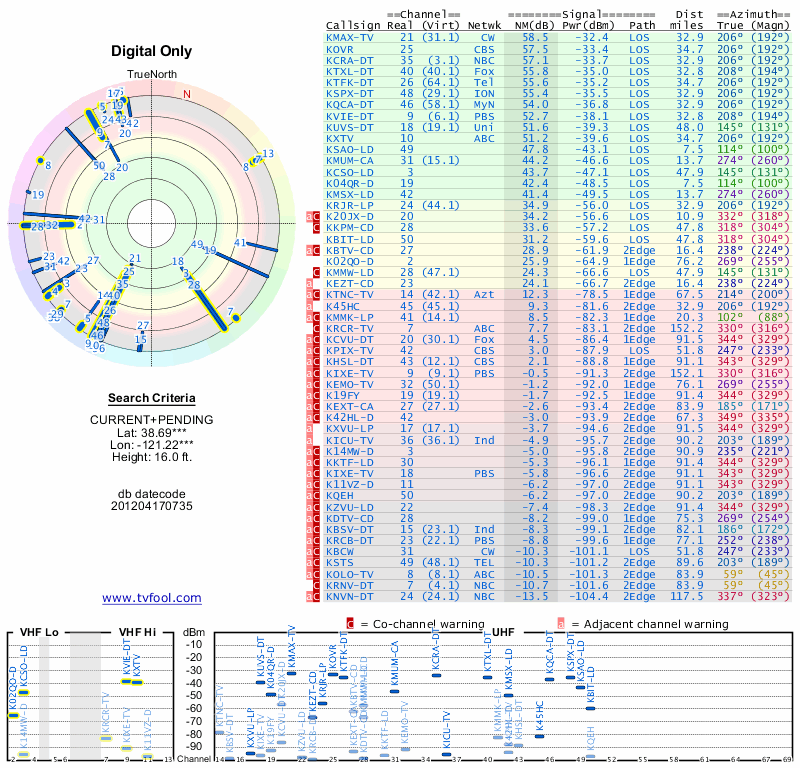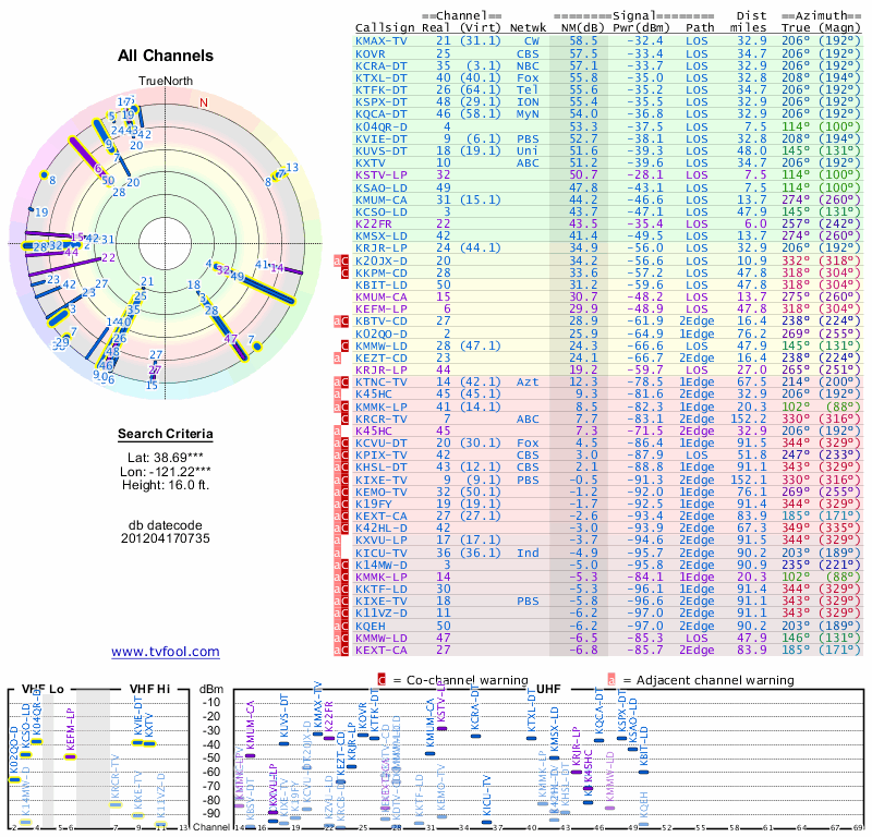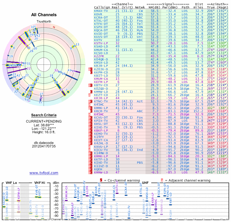 Here are the results for your location. The transmitter database was last updated on June 7, 2013. For more information about these plots and how to interpret them, please check out the Signal Analysis FAQ.