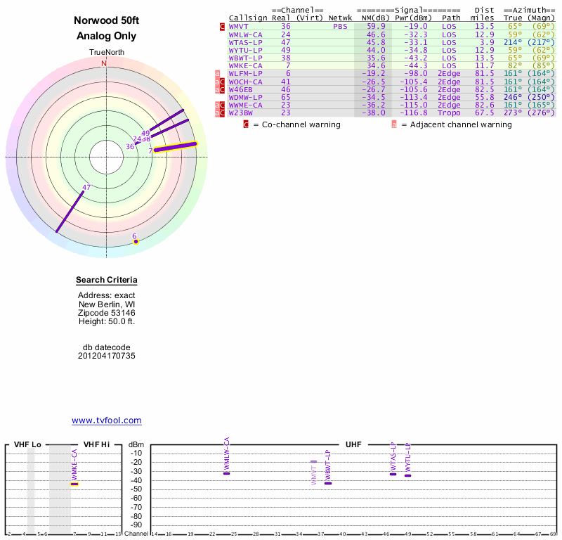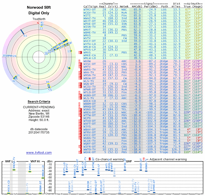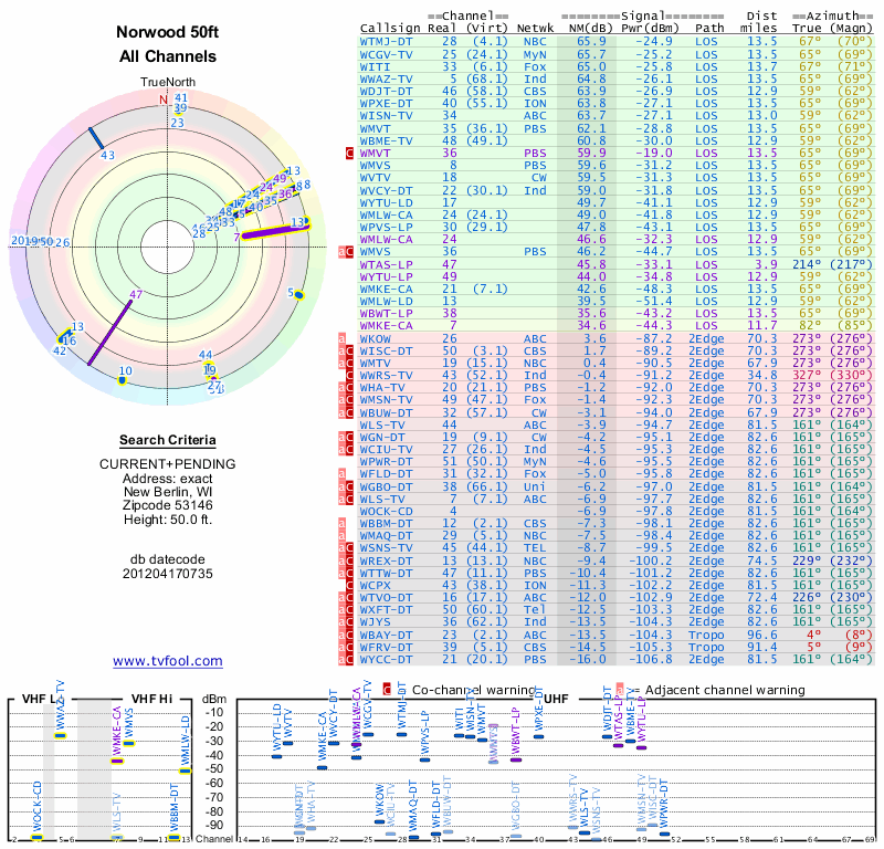 Here are the results for your location. The transmitter database was last updated on June 7, 2013. For more information about these plots and how to interpret them, please check out the Signal Analysis FAQ.